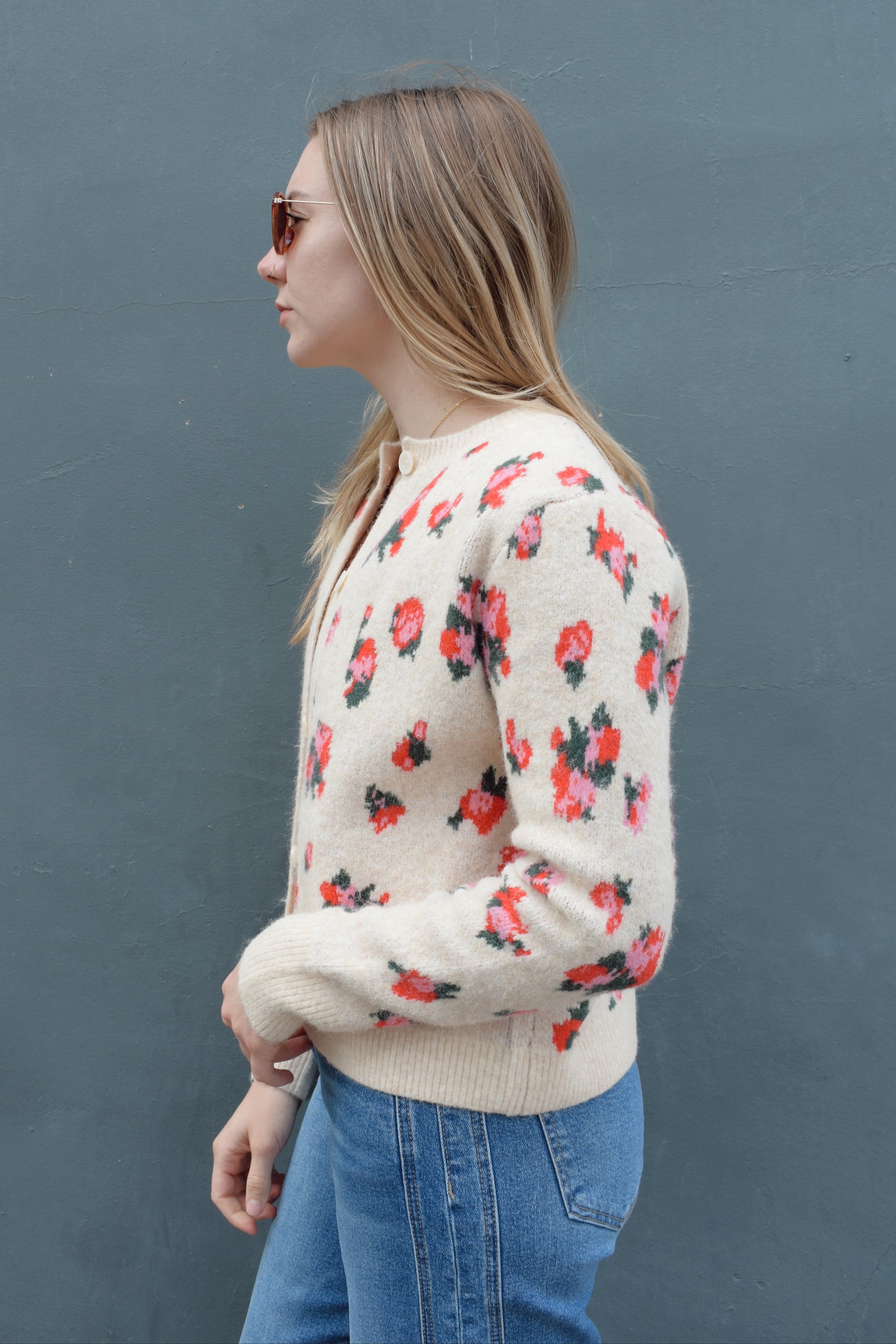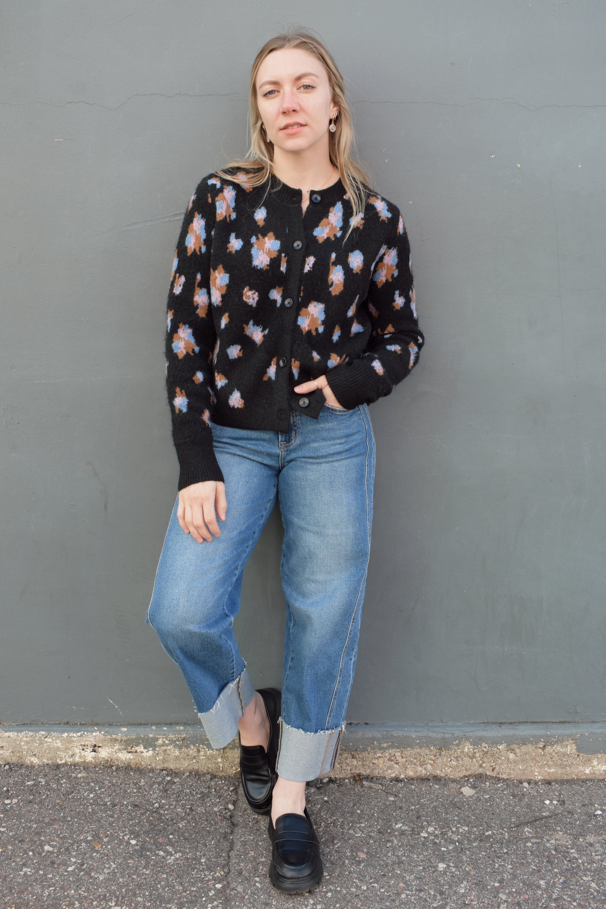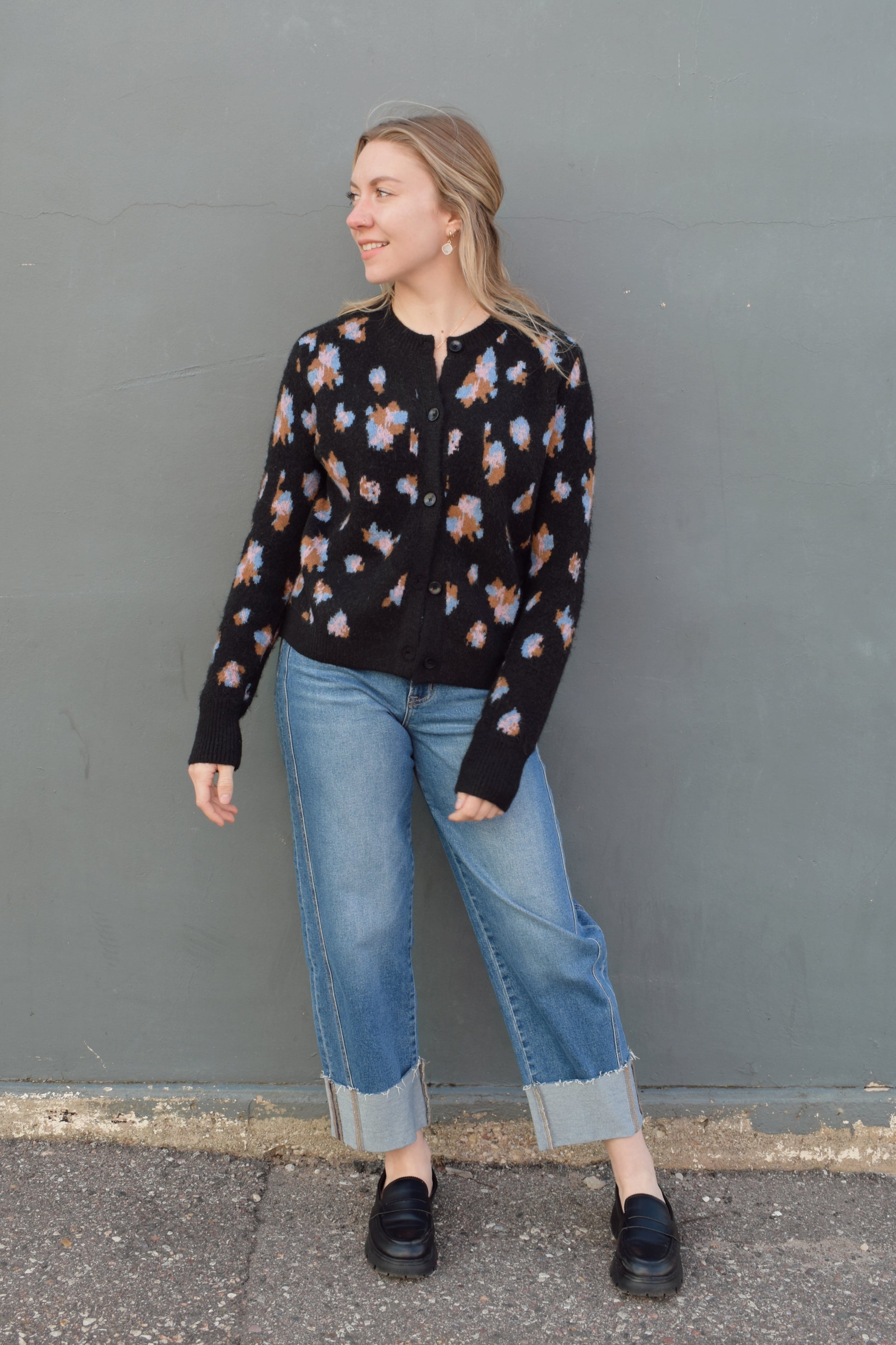 This abstract floral cardigan features a ribbed round neckline and a button-down front. It showcases a unique all-over abstract floral knit pattern, complemented by long sleeves with ribbed cuffs. Designed to sit at the waist, this cardigan offers both style and comfort for your everyday wardrobe.