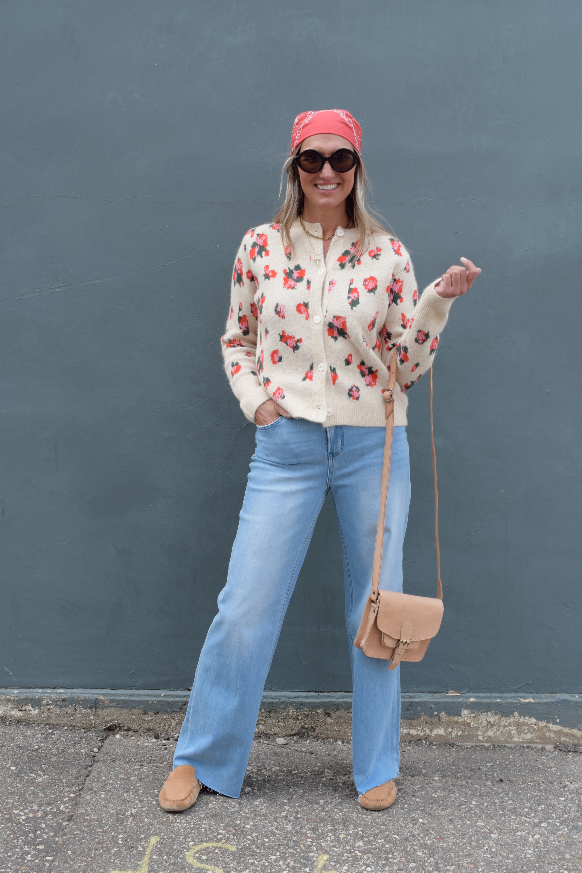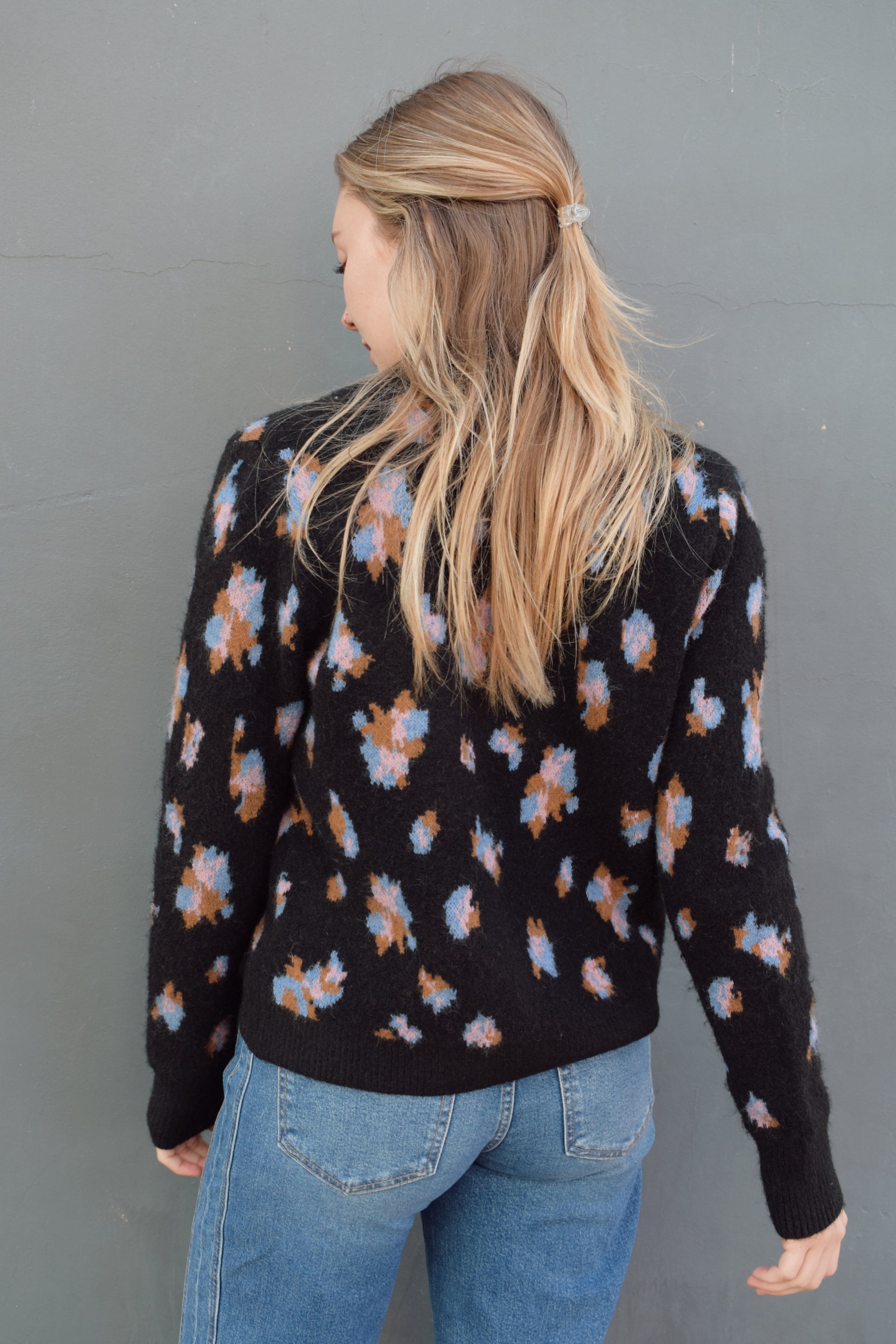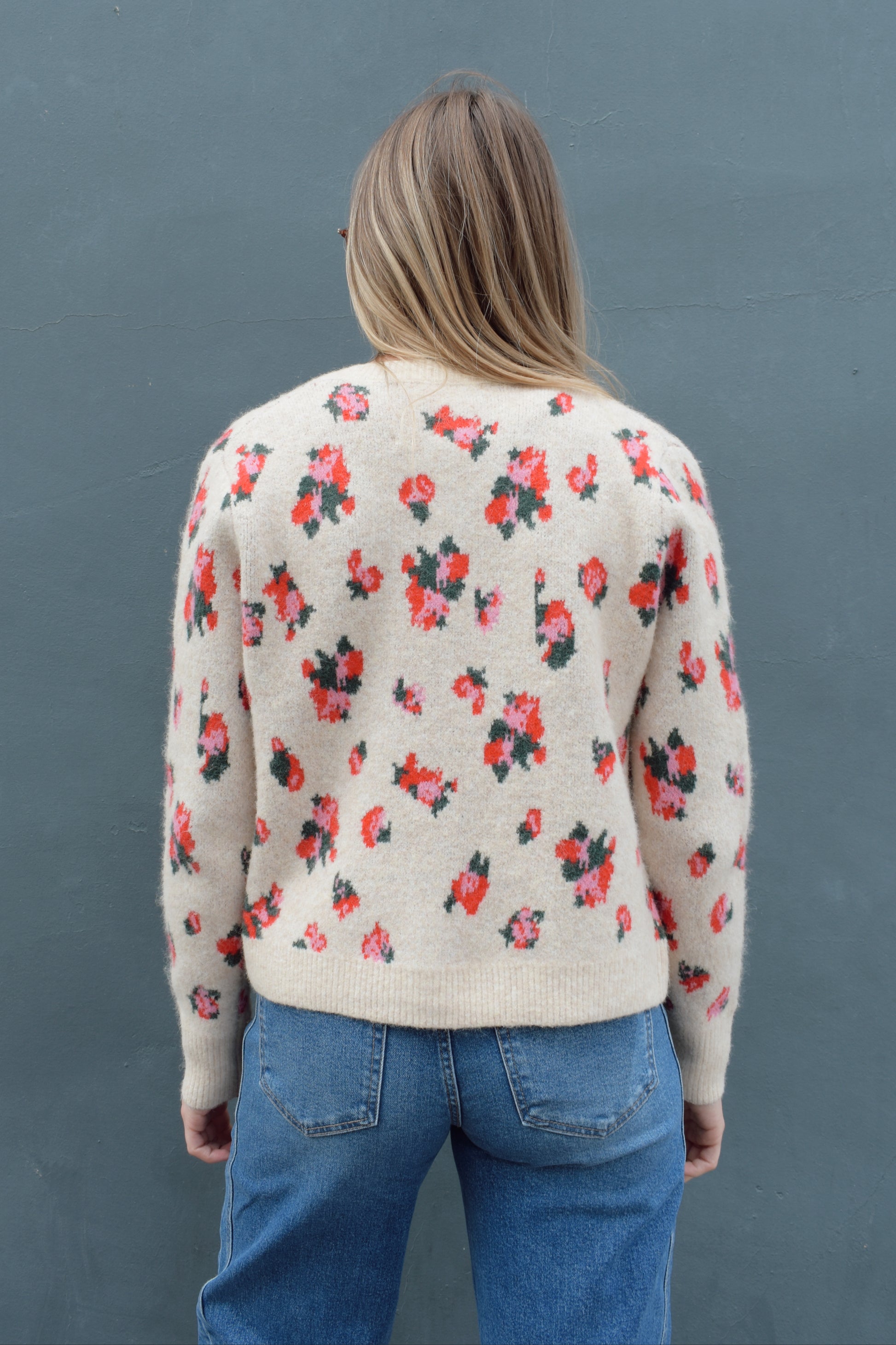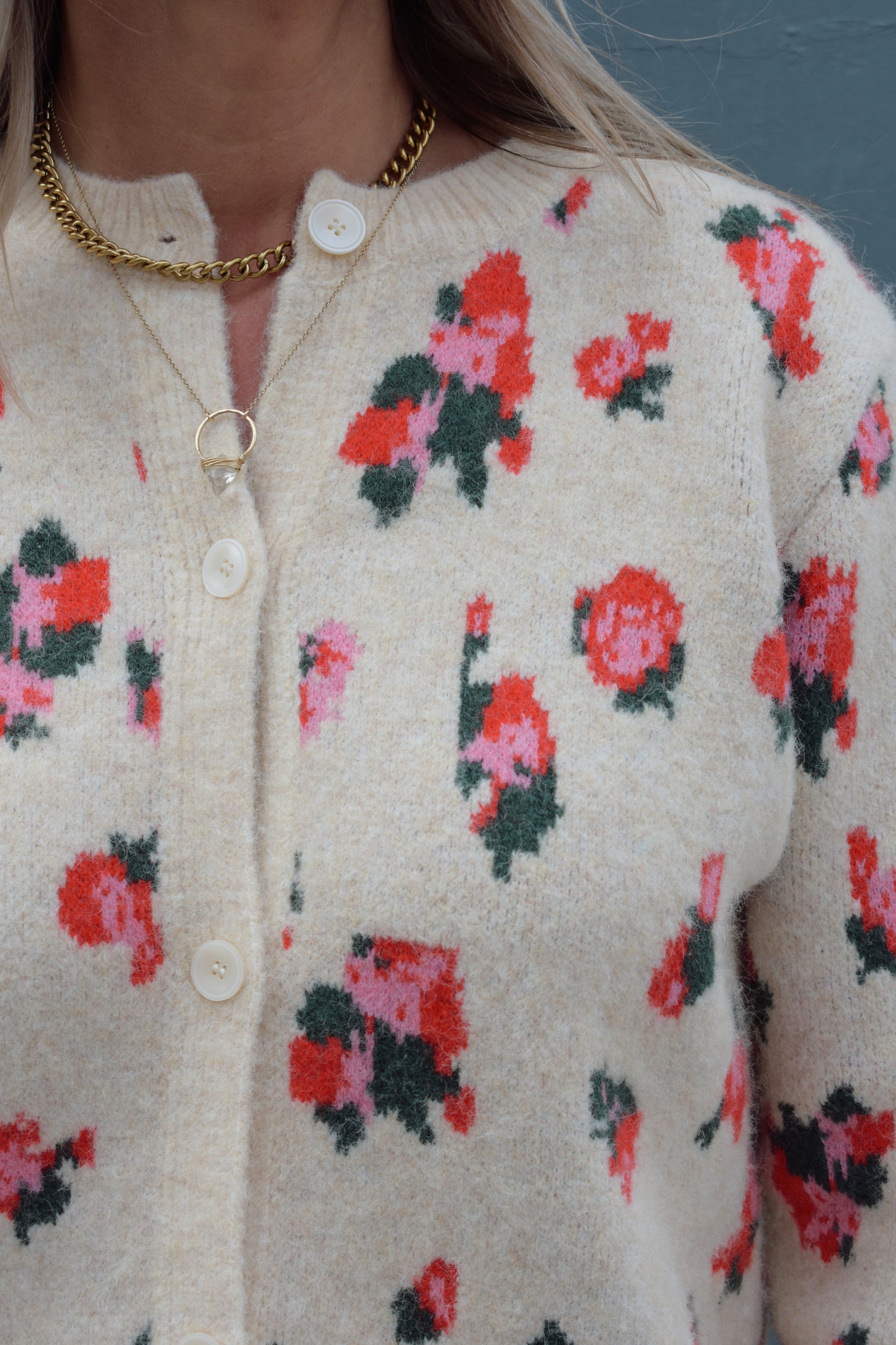This abstract floral cardigan features a ribbed round neckline and a button-down front. It showcases a unique all-over abstract floral knit pattern, complemented by long sleeves with ribbed cuffs. Designed to sit at the waist, this cardigan offers both style and comfort for your everyday wardrobe.