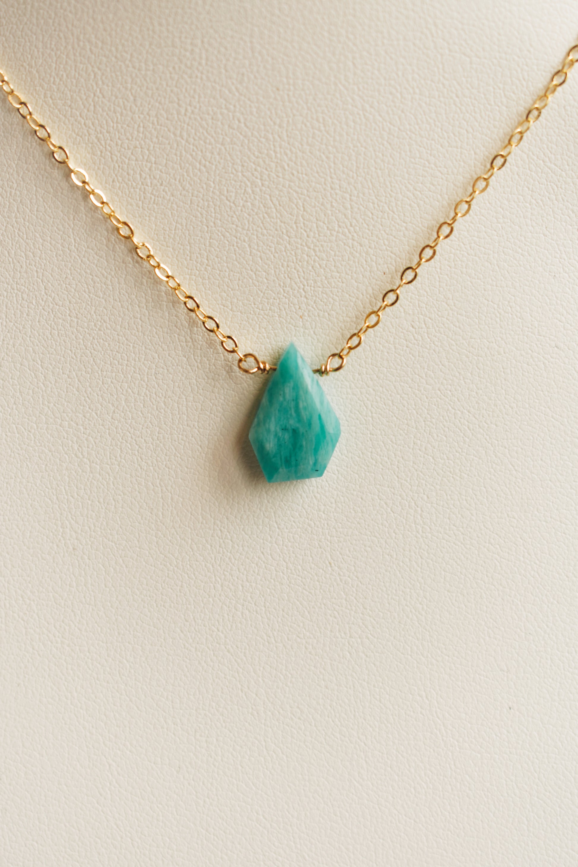 This amazonite teardrop choker features a delicate, faceted pendant set on a dainty gold-plated chain. With its elegant design and quality materials, this necklace is the perfect addition to any outfit.
