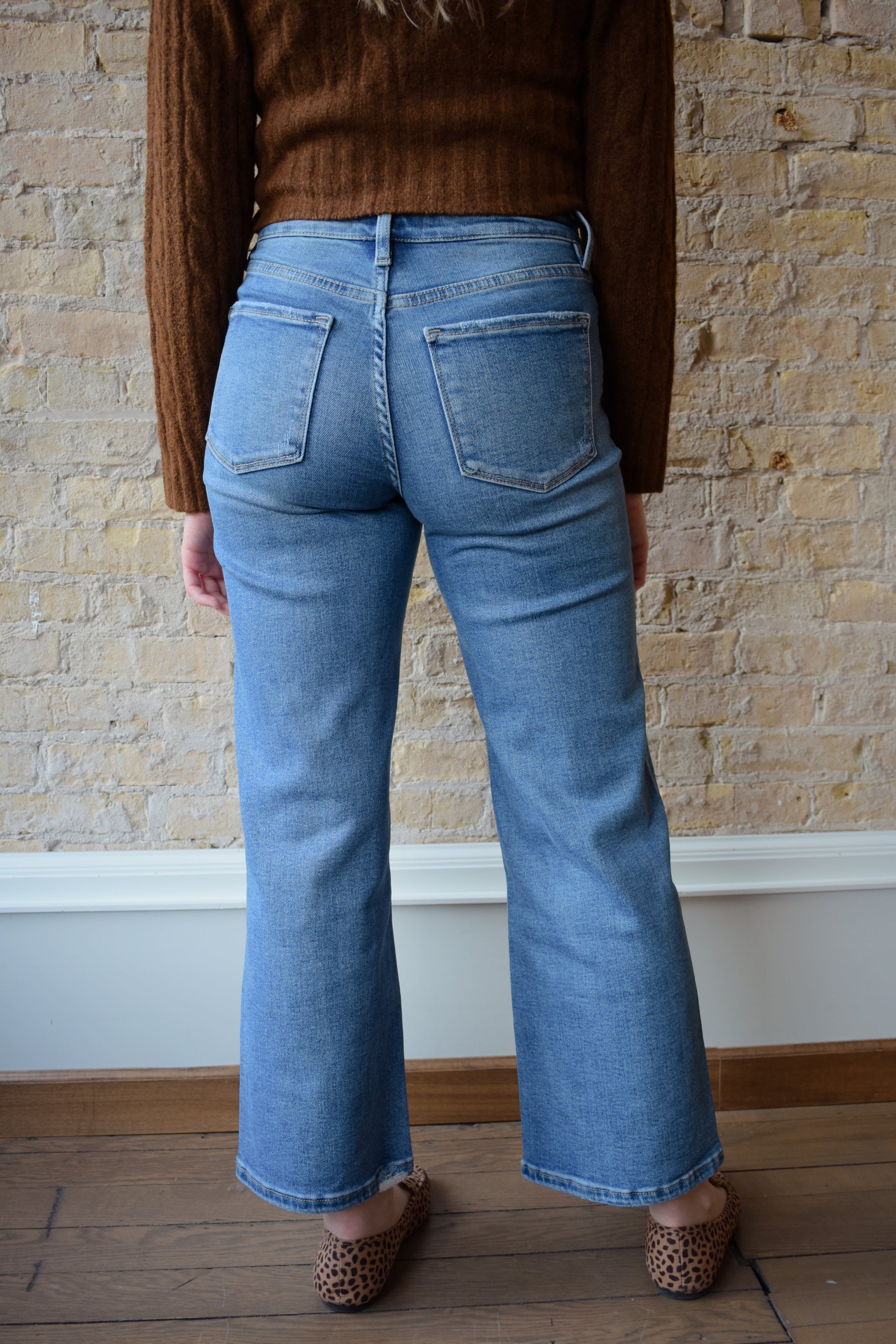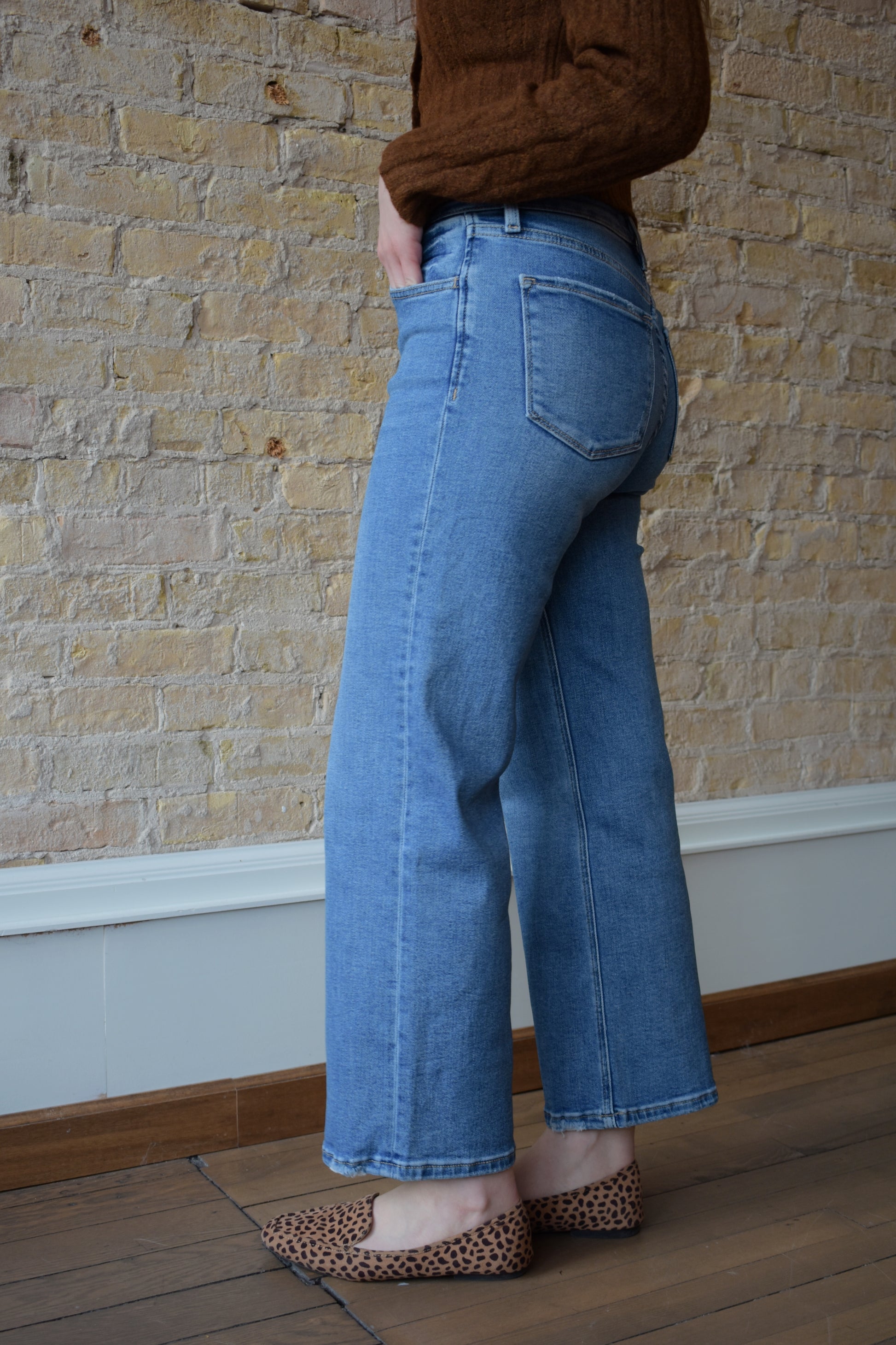 Elevate your denim collection with these high-rise ankle wide jeans that deliver both style and comfort. Crafted from stretch denim, they feature a flattering high-rise waist, classic five-pocket construction, and subtle distressed detailing for an effortlessly cool aesthetic. The finished hem hits perfectly at the ankle, while the medium wash offers versatile styling options. Designed for the modern woman who refuses to compromise on fit or fashion, these jeans are your new everyday essential.