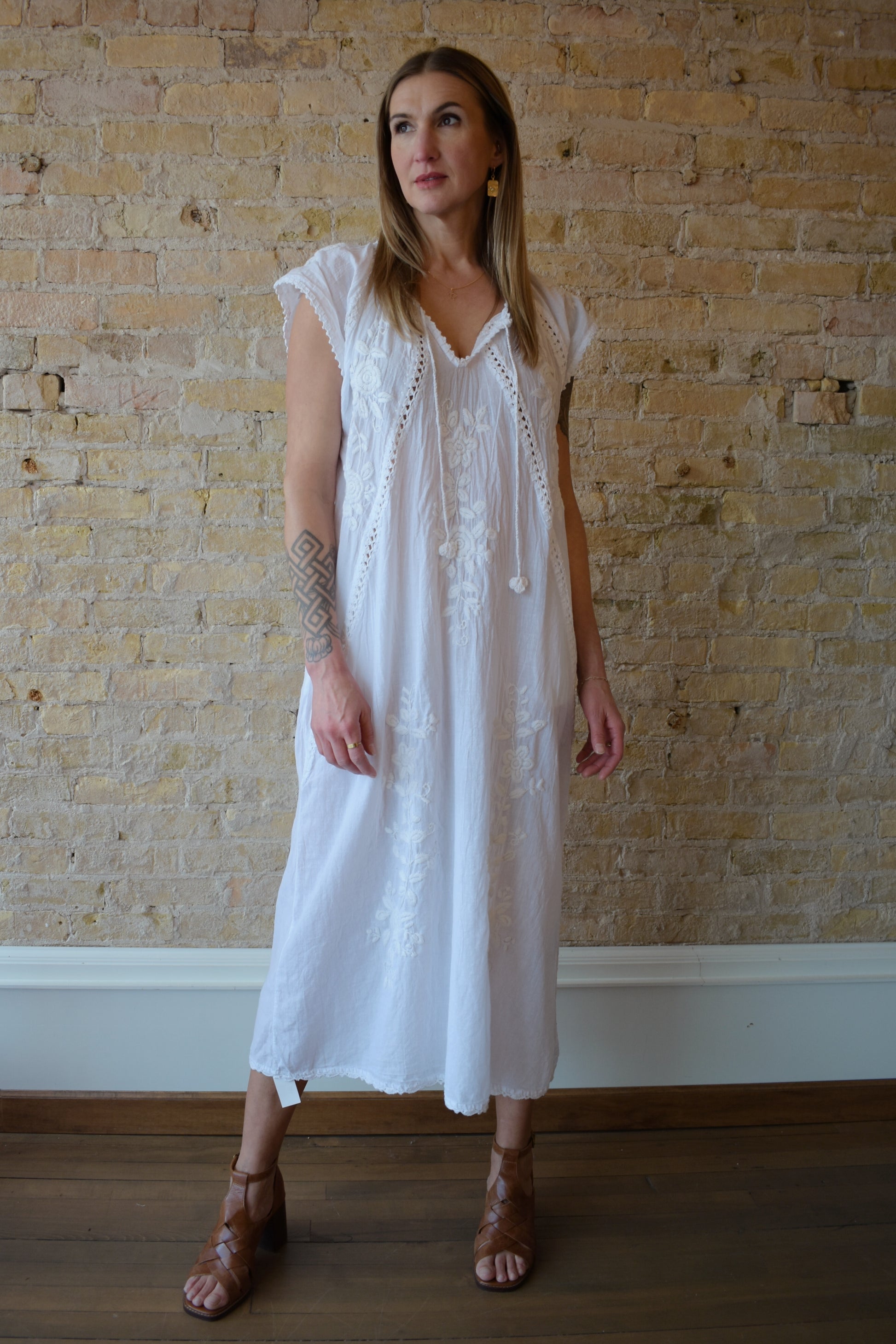 Crafted from breathable double cotton gauze, this Clementine Dress combines delicate floral embroidery with intricate crochet detailing for an effortlessly elegant look. The short sleeves and flowing maxi silhouette create a flattering, versatile piece perfect for warm weather styling. Lightweight and comfortable, it's designed to keep you cool while making a sophisticated statement.