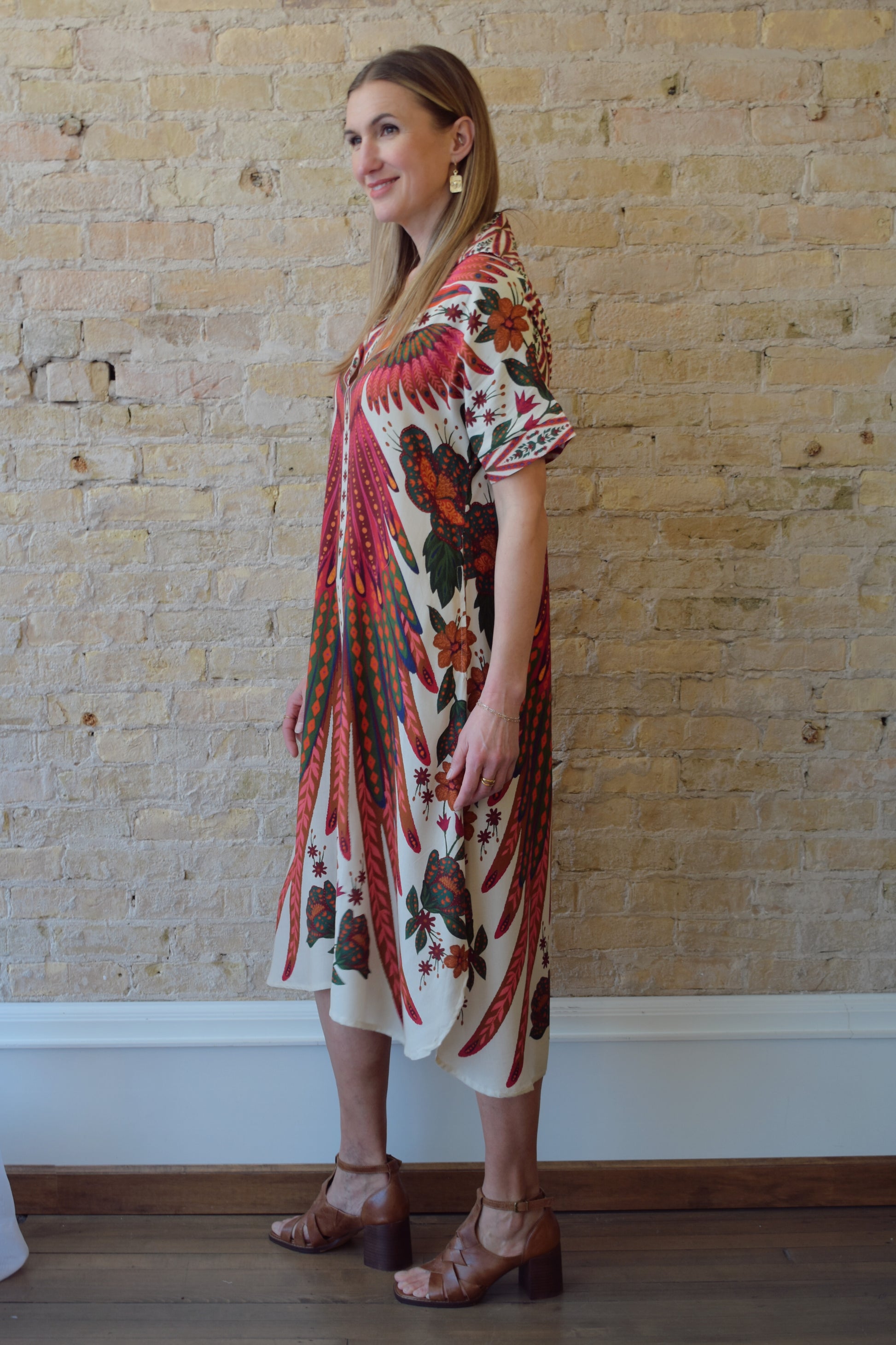 Discover effortless elegance with the Tallulah Dress, featuring a luxurious silky fabric in an eye-catching bird of paradise print. This versatile midi piece transitions seamlessly from casual outings to evening affairs—simply pair with sneakers for laid-back charm or elevate with strappy heels for sophisticated style. The relaxed silhouette, complete with practical side pockets and flattering side slits, makes it your go-to choice for any occasion. Short sleeves and a collared neckline add polished detail, while the quarter button placket offers easy styling. Throw it on and go—the Tallulah is the dress you'll reach for again and again.