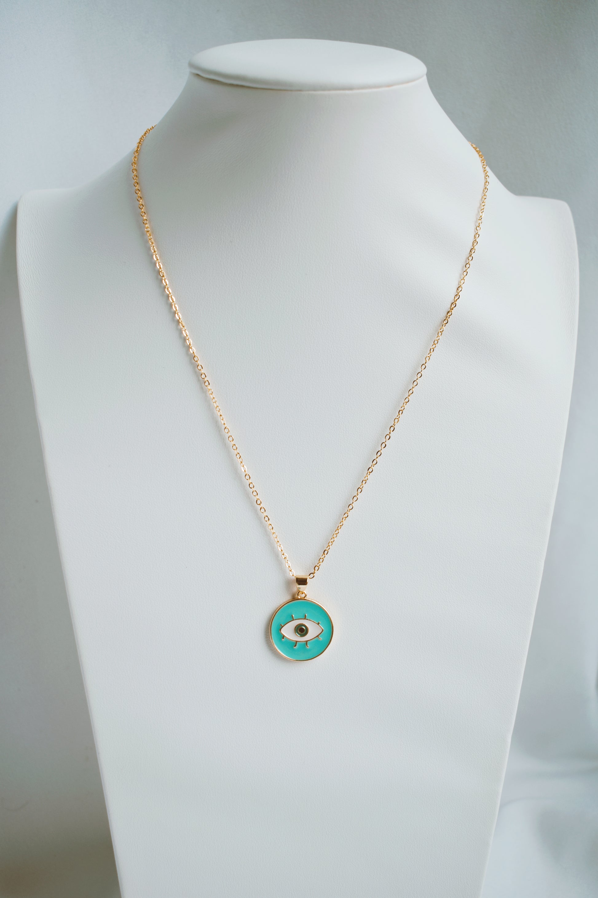 Discover the mystical powers of the Evil Eye Pendant Necklace. Handcrafted with precision and featuring a stunning evil eye design hung on a gold plated chain. Choose serene turquoise or delicate pink for an aura of protection and positivity. Make a statement with this unique and elegant necklace.