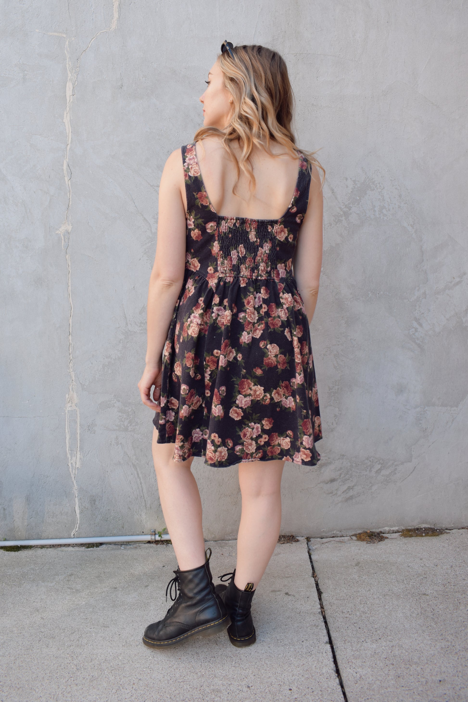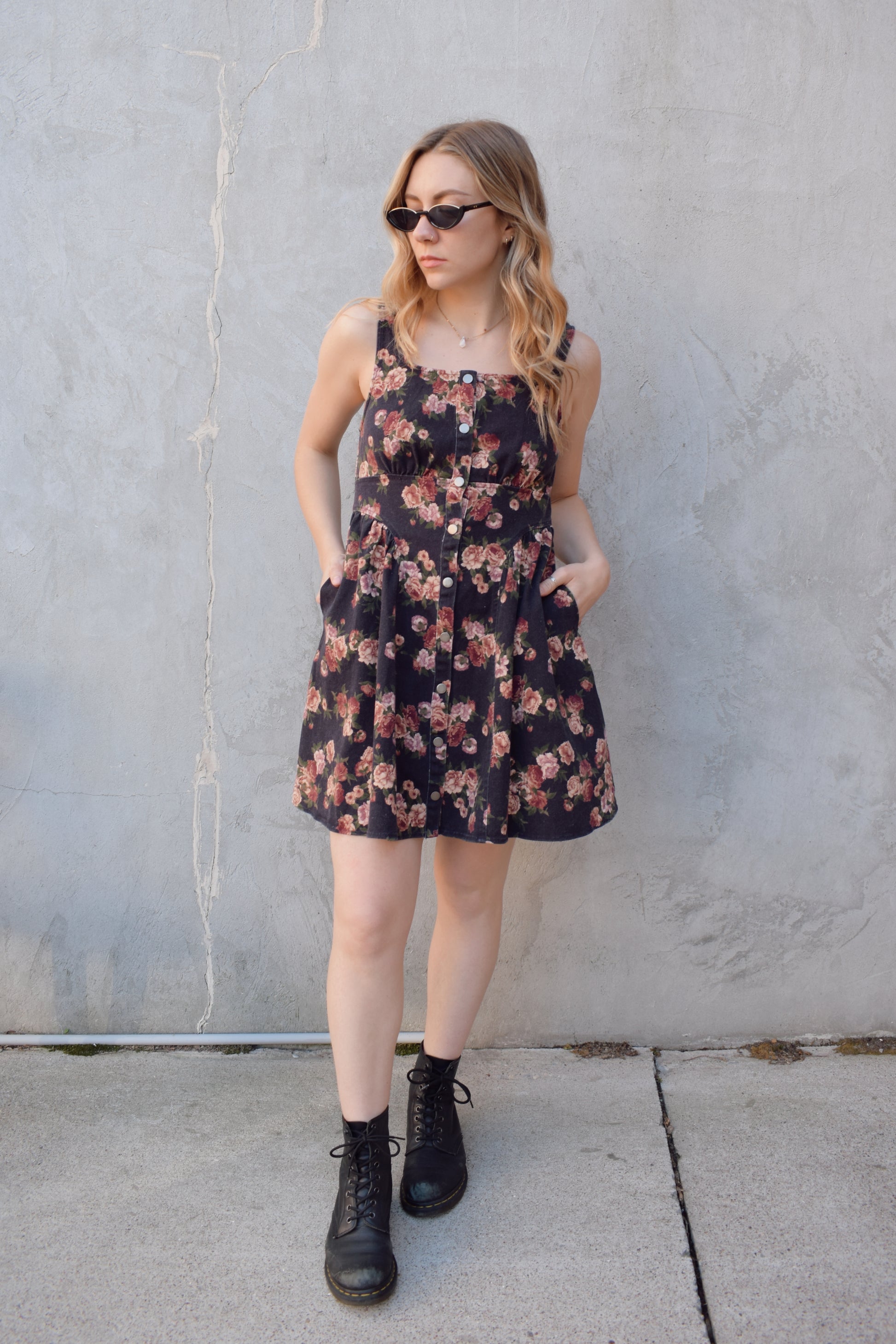 This stonewashed mini dress showcases a retro 90's floral pattern, snap-button front closure, and pleated skirt accents. With its square neckline and sleeveless cut, it provides a flattering fit that complements a variety of body shapes.