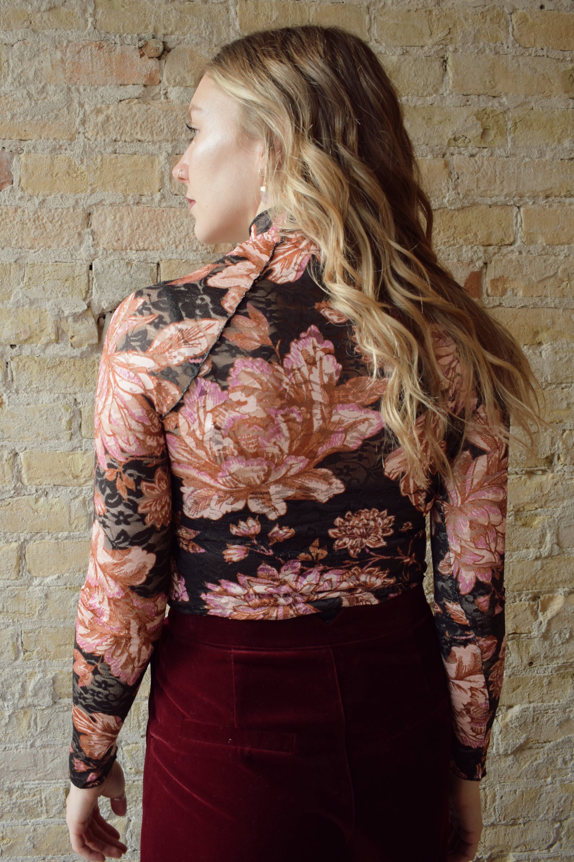 Elevate your wardrobe with this stunning floral mesh top, featuring delicate lace detailing and a sophisticated high neckline. The long sleeves and stretch fabric create a flattering silhouette that moves with you, while the intricate floral print adds an effortless touch of elegance to any outfit. Perfect for layering or wearing solo, this versatile piece transitions seamlessly from day to night.