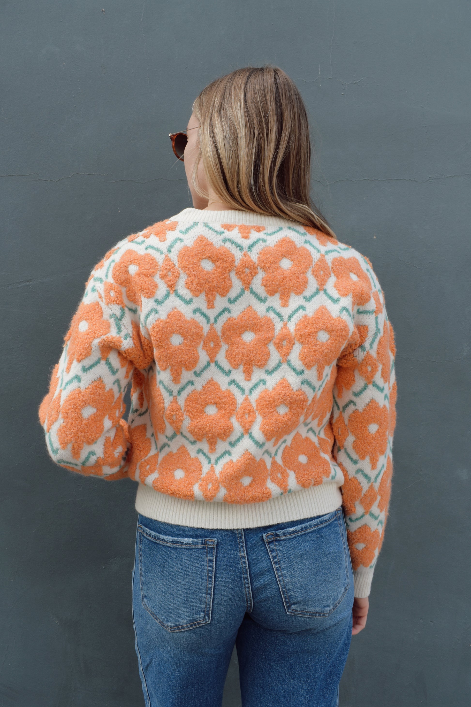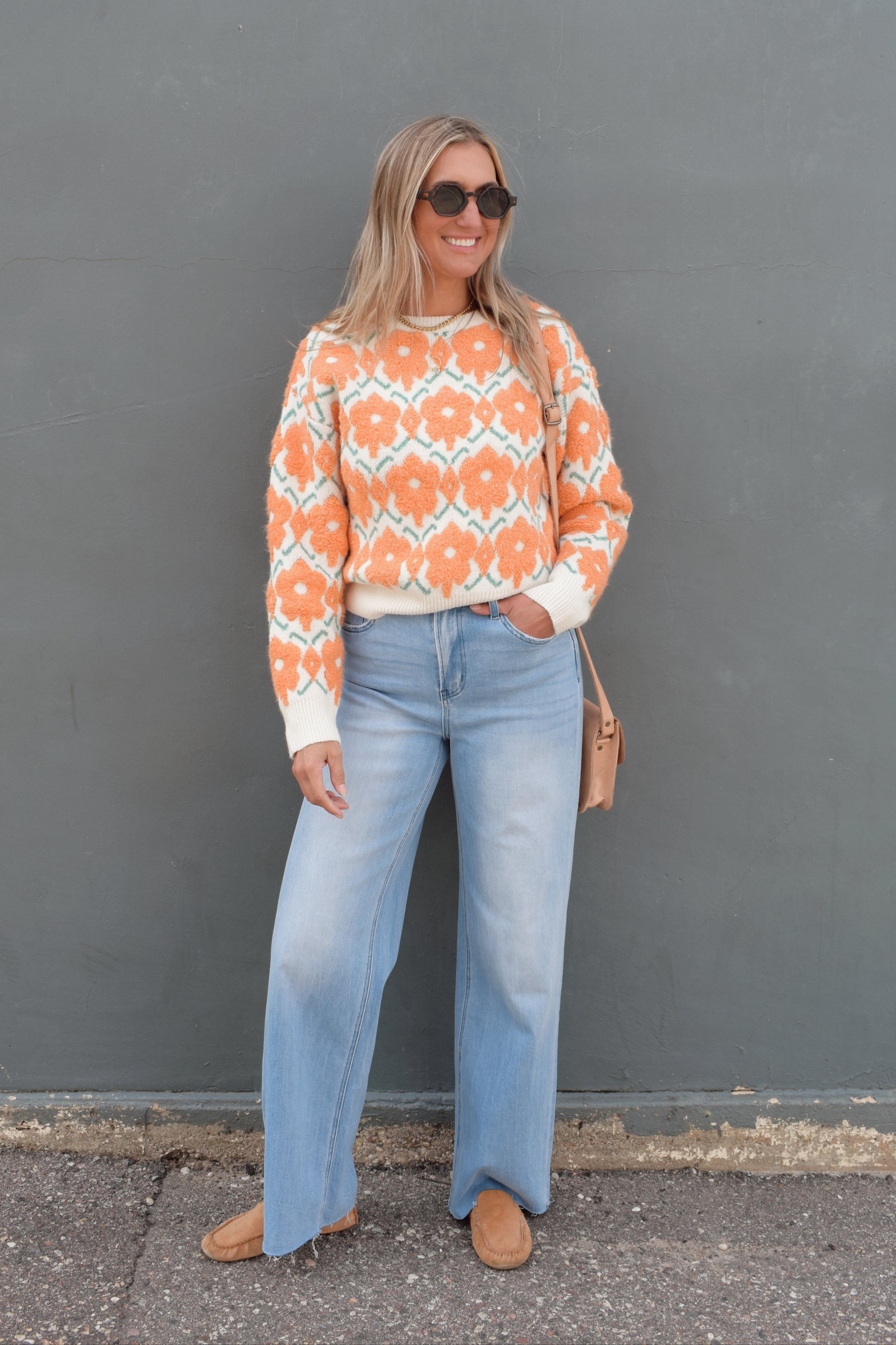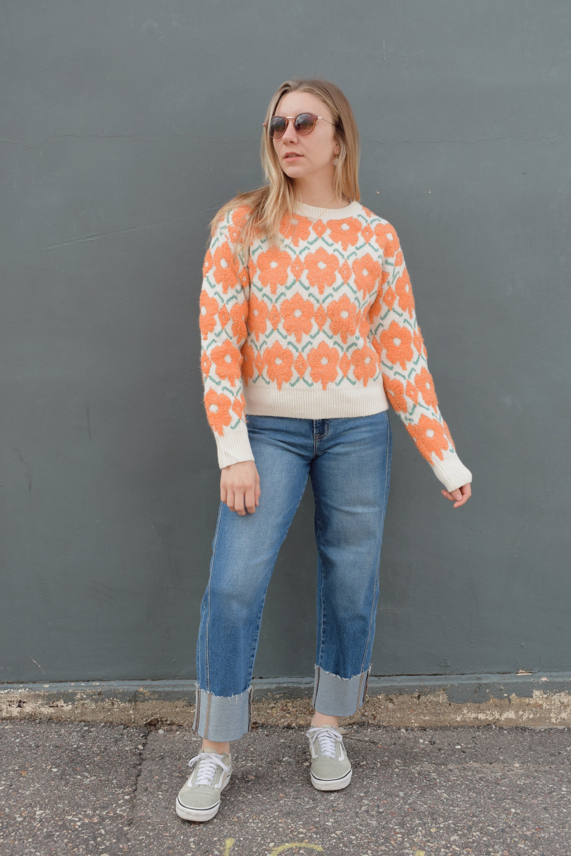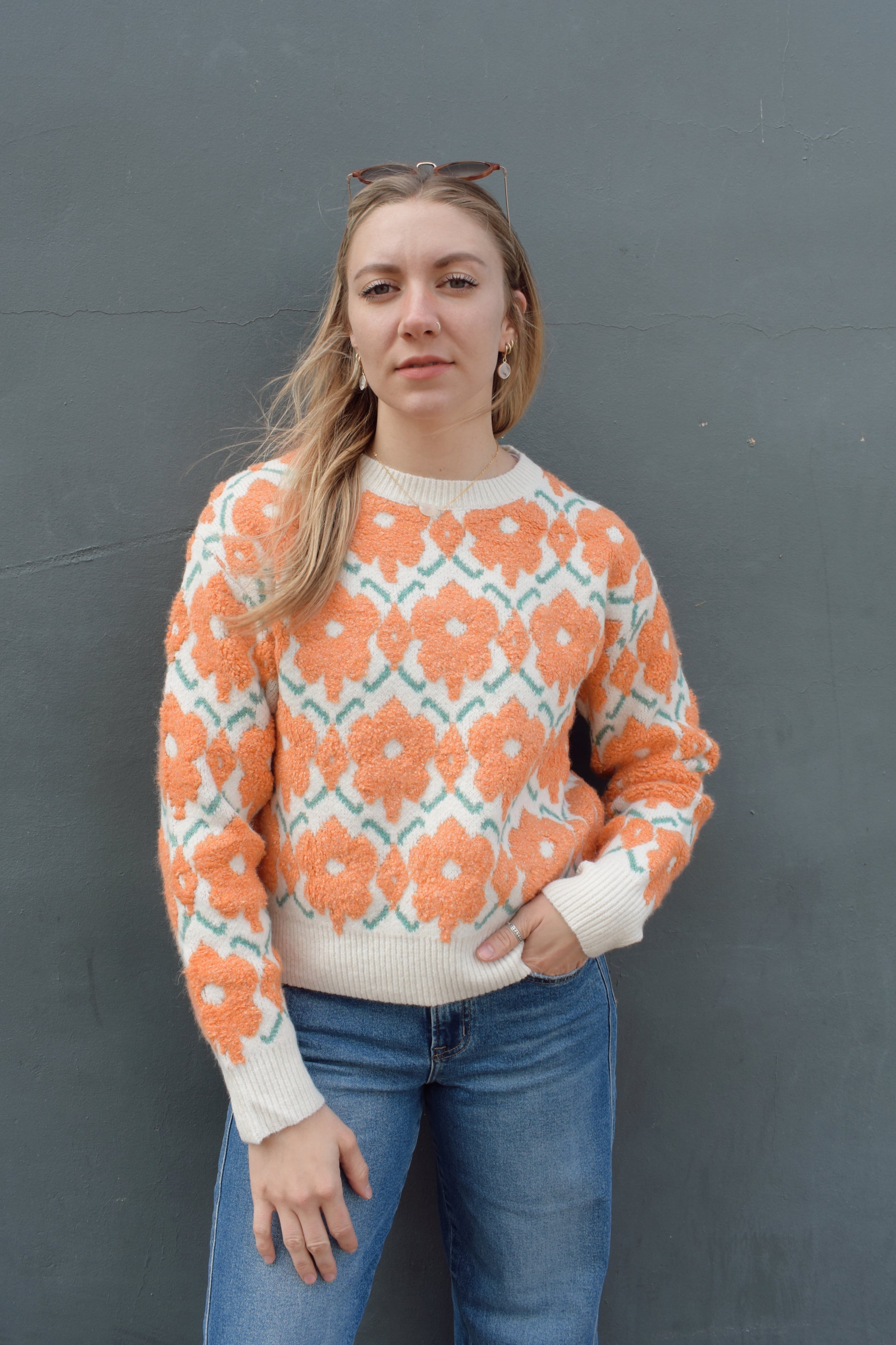 Experience cozy charm with this floral fuzzy sweater featuring a soft textured knit. It offers a relaxed pullover fit with a round neckline and drop shoulders for easy movement. Long sleeves and ribbed trims at the neckline, cuffs, and hem ensure lasting comfort and style. The delicate floral pattern adds a touch of warmth and elegance to your wardrobe.