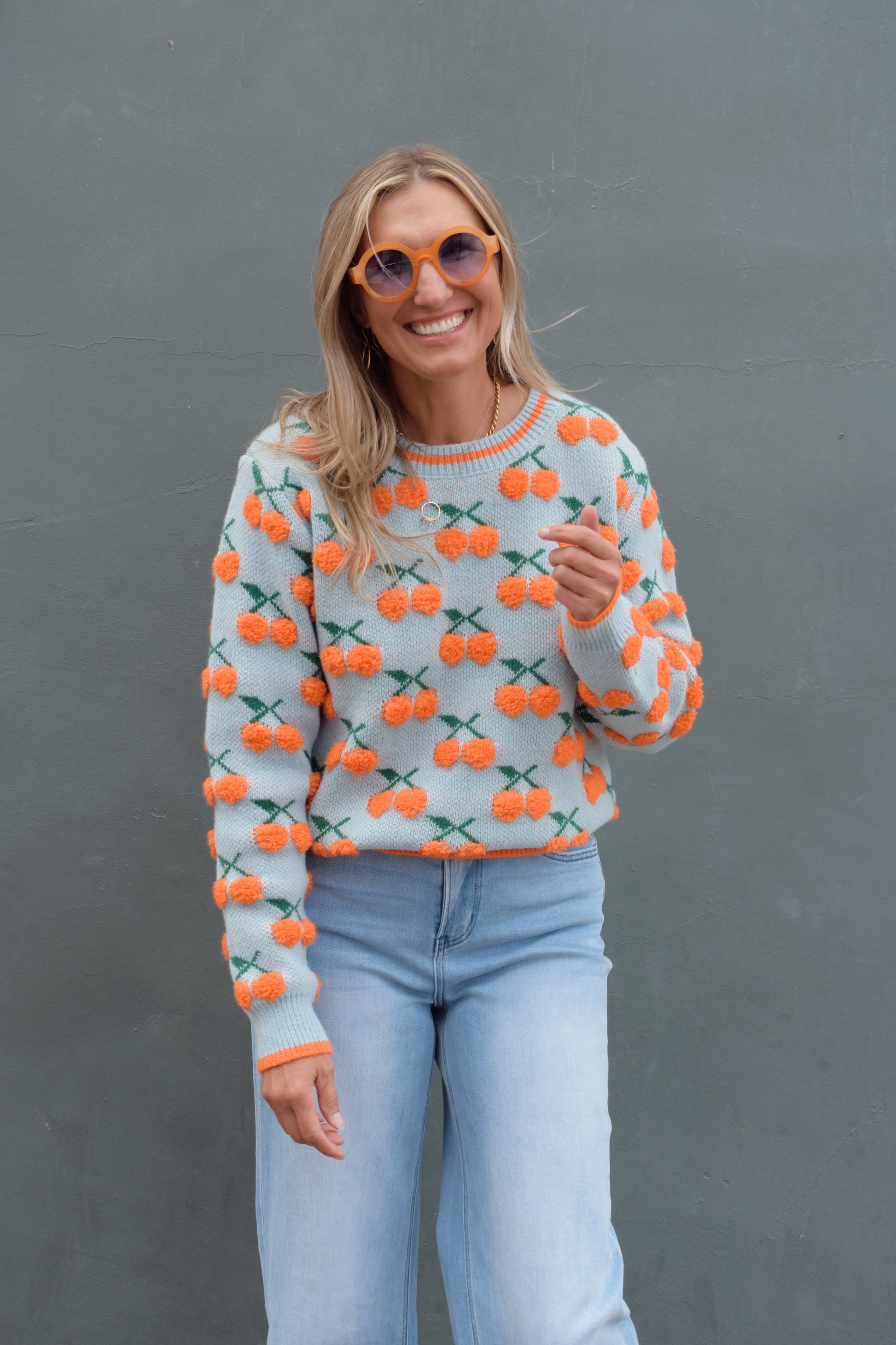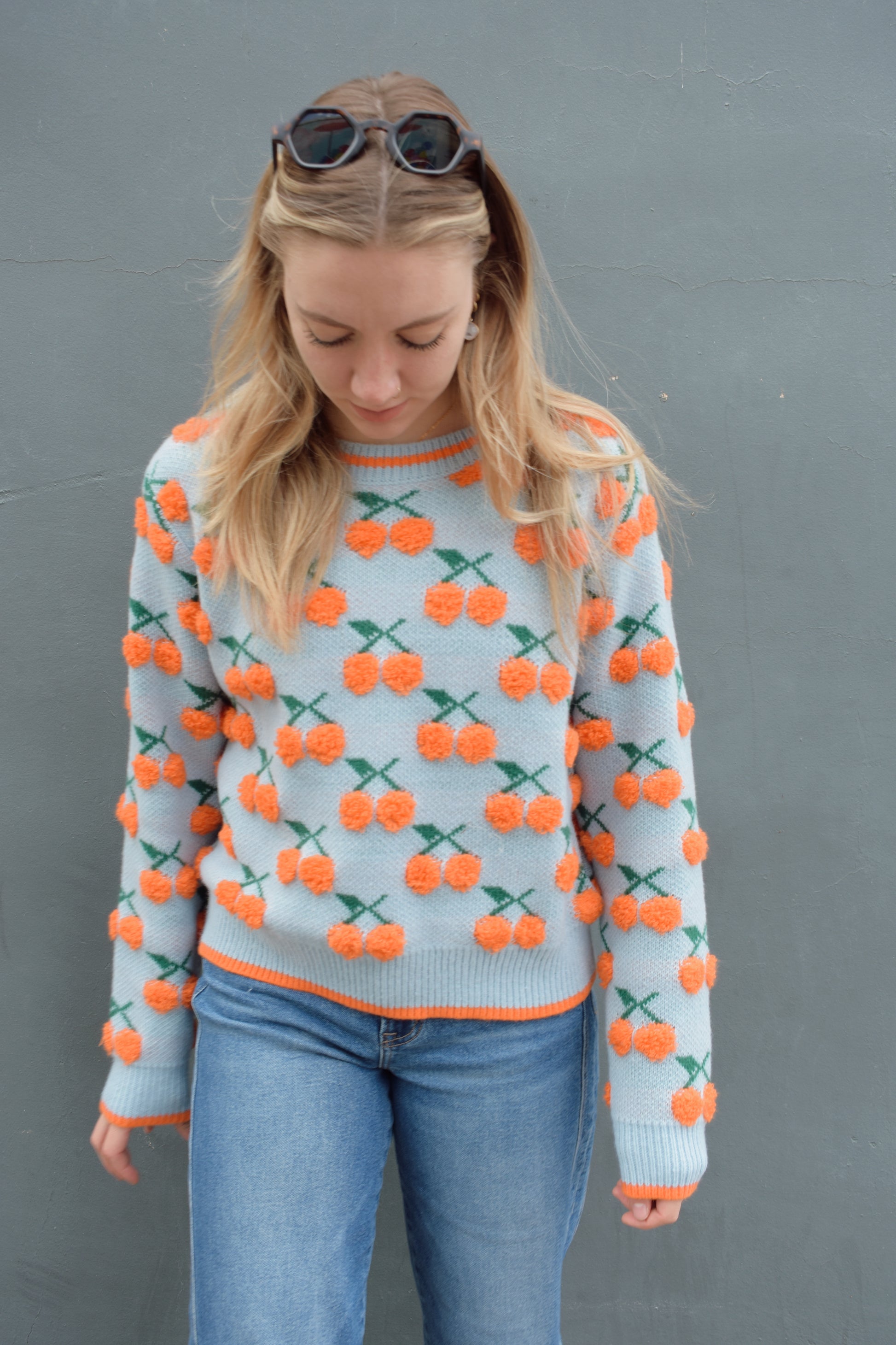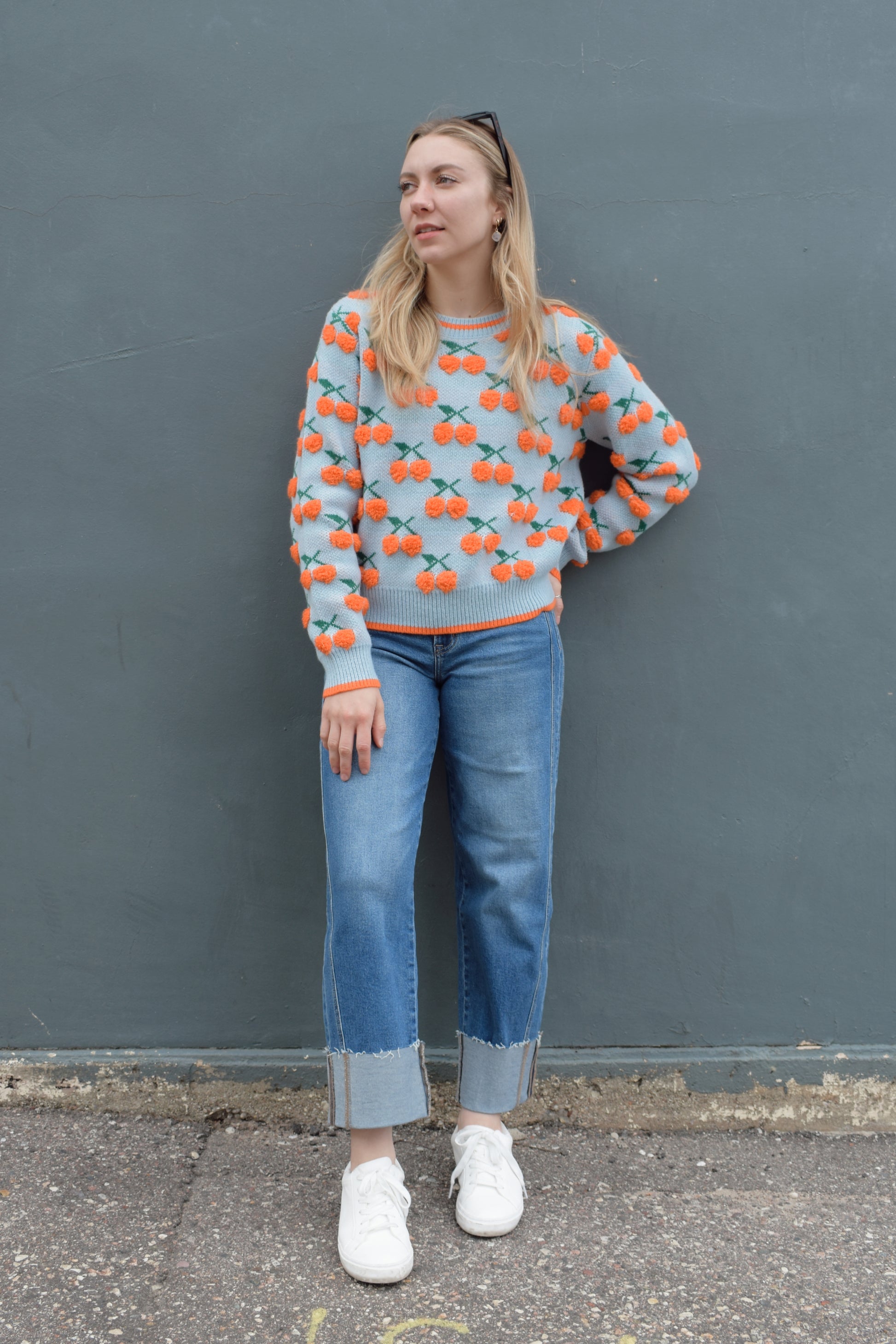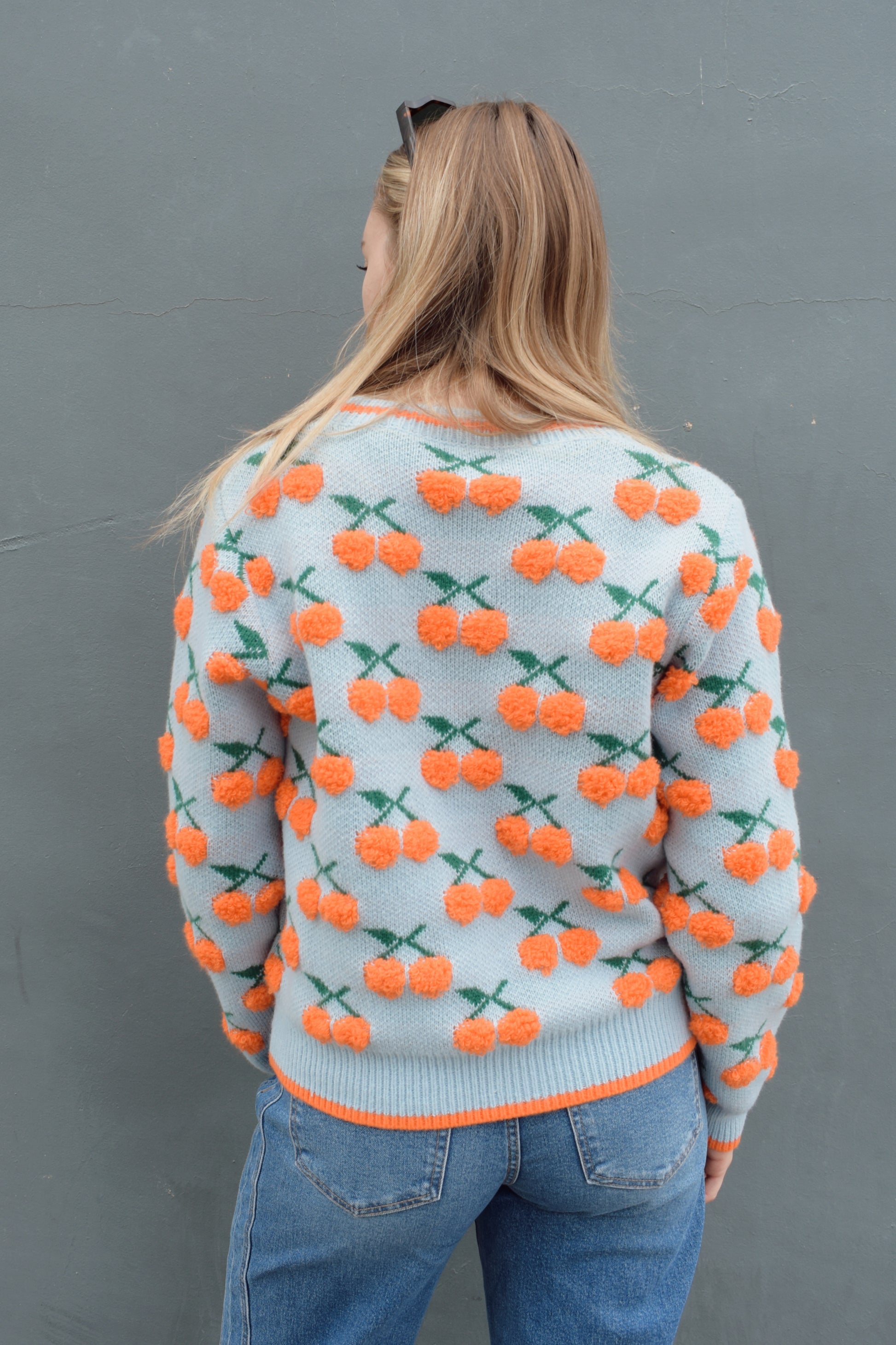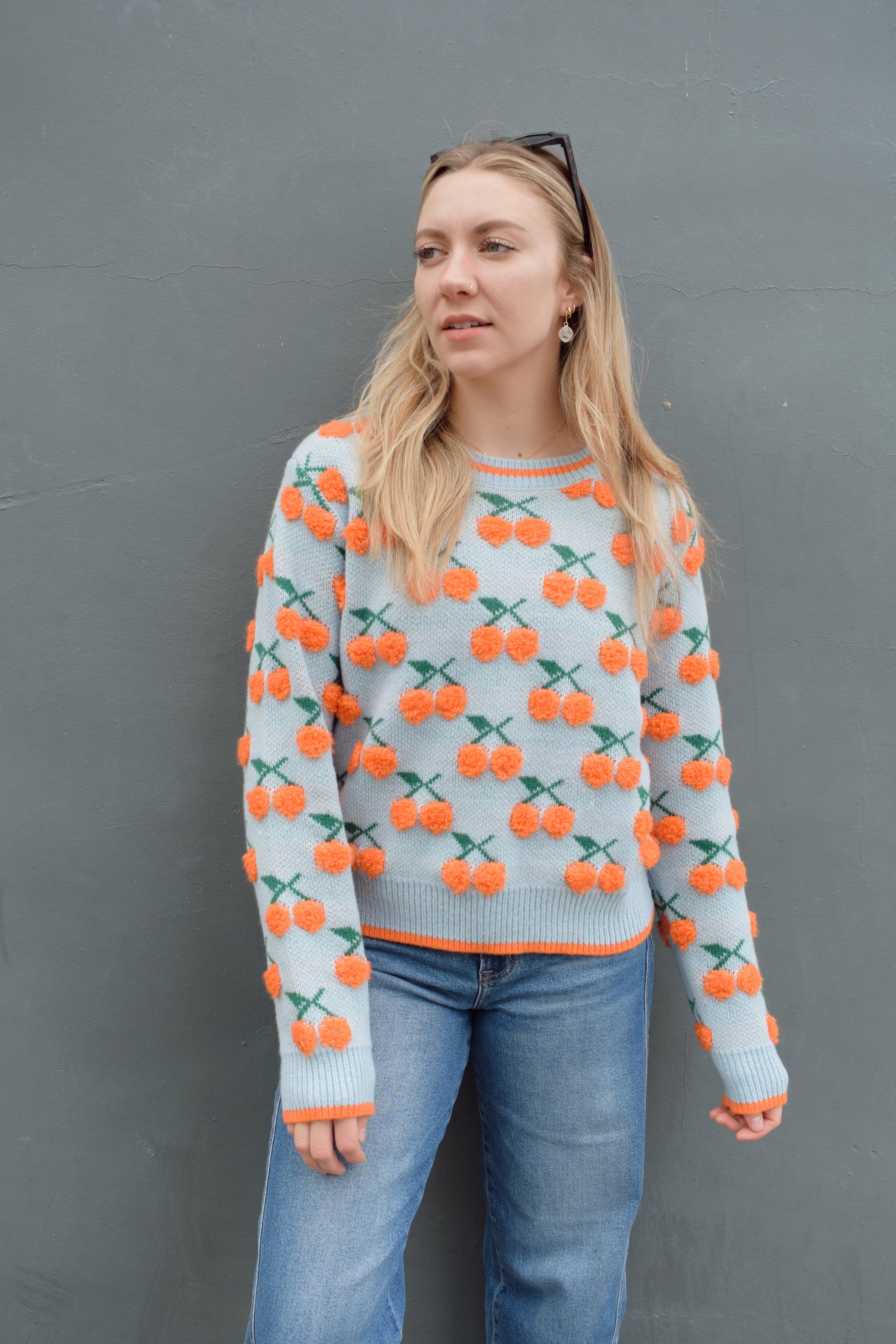 Embrace cozy charm with the fuzzy cherry sweater, featuring a ribbed round neckline and a soft, fuzzy knit cherry motif. Designed with long sleeves and ribbed cuffs, it offers a comfortable yet stylish fit that hits at the waist with a relaxed silhouette and ribbed hem for added structure.
