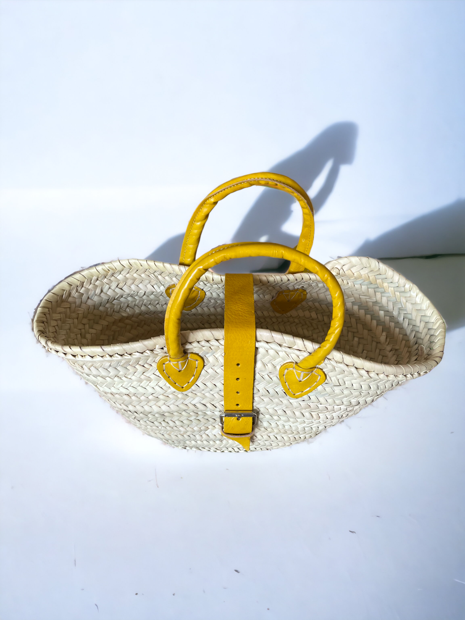 This French market classic is handwoven in Morocco from date palm leaves, creating a rich herringbone texture of sturdy natural fibers. Anchored by leather tabs, the doubled straps allow the basket to transition from tote to shoulder bag.
