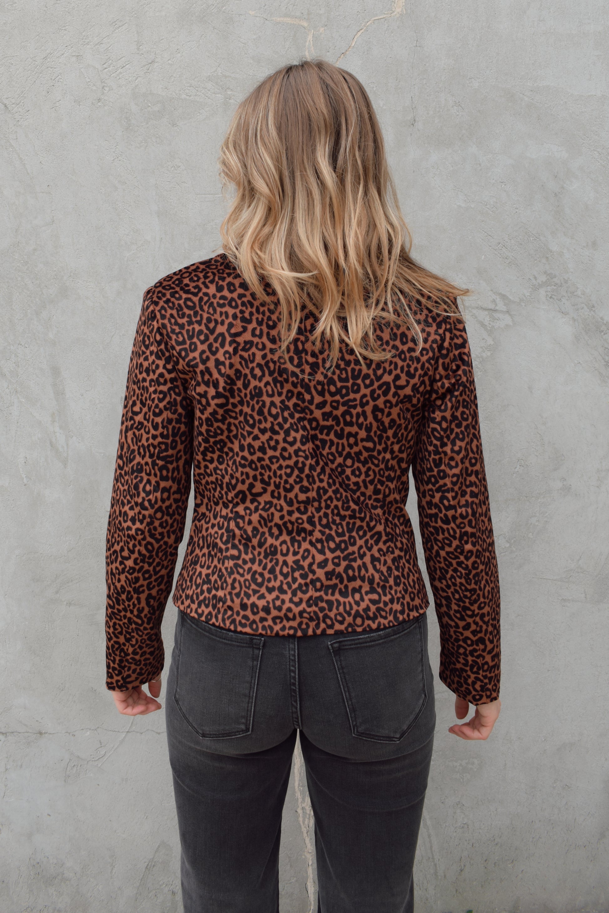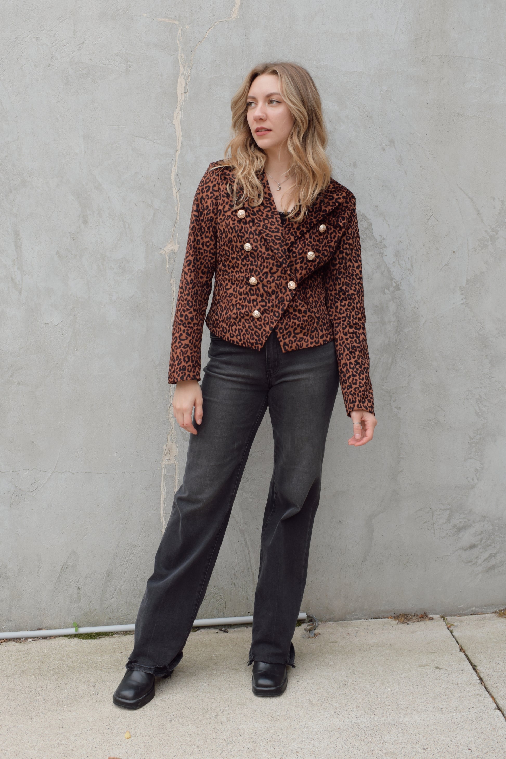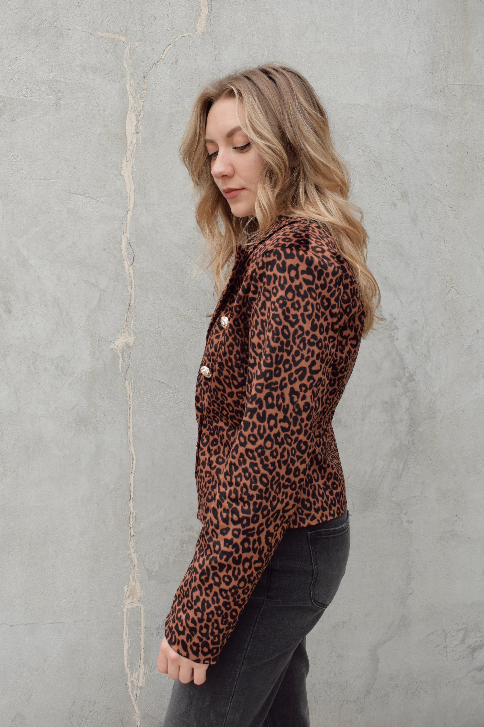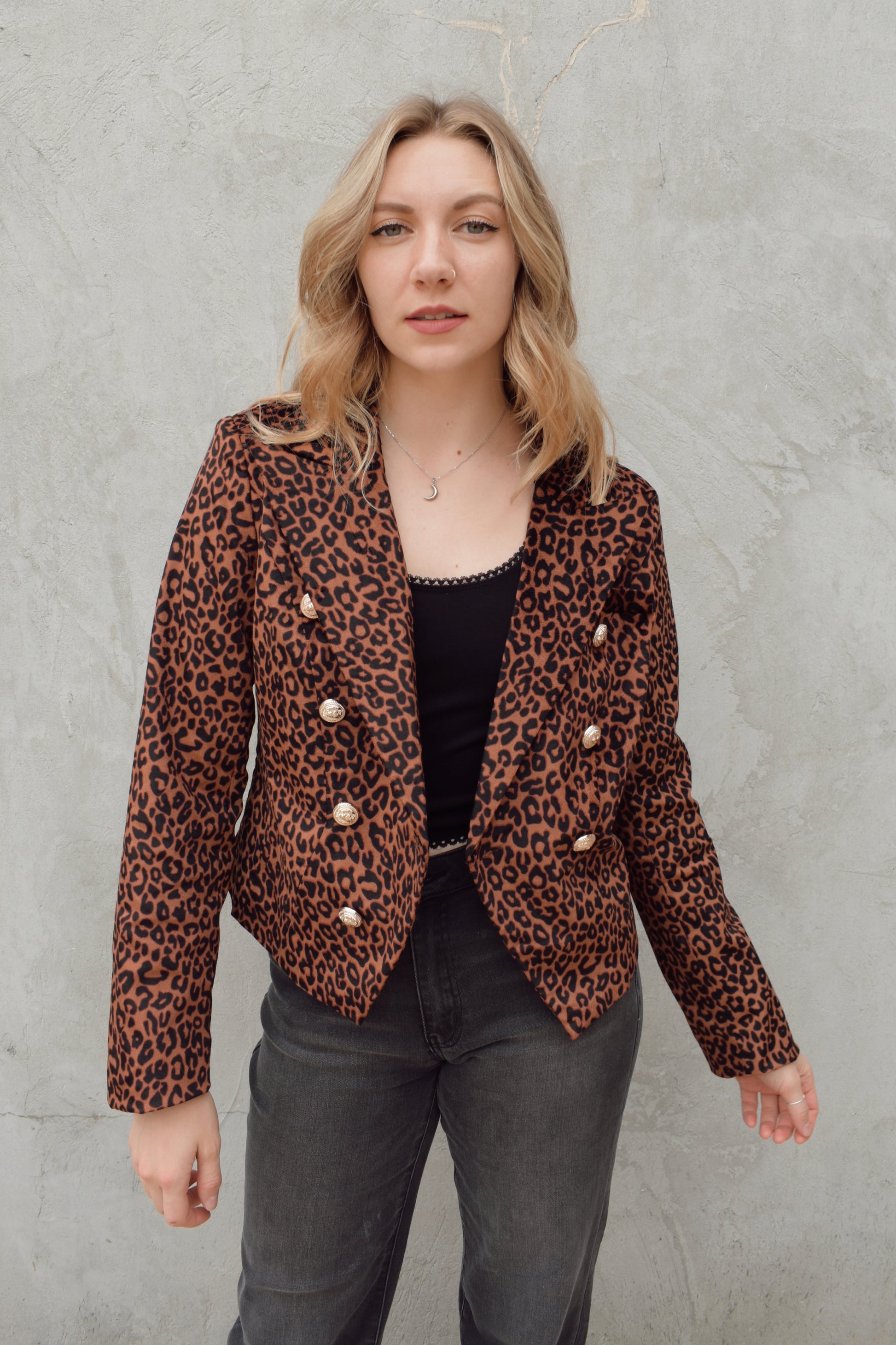 Make a statement with this tailored leopard print blazer featuring a structured double-breasted design. The gold-tone buttons add a touch of luxury, elevating your look with confidence and style. Perfect for standing out in any setting.