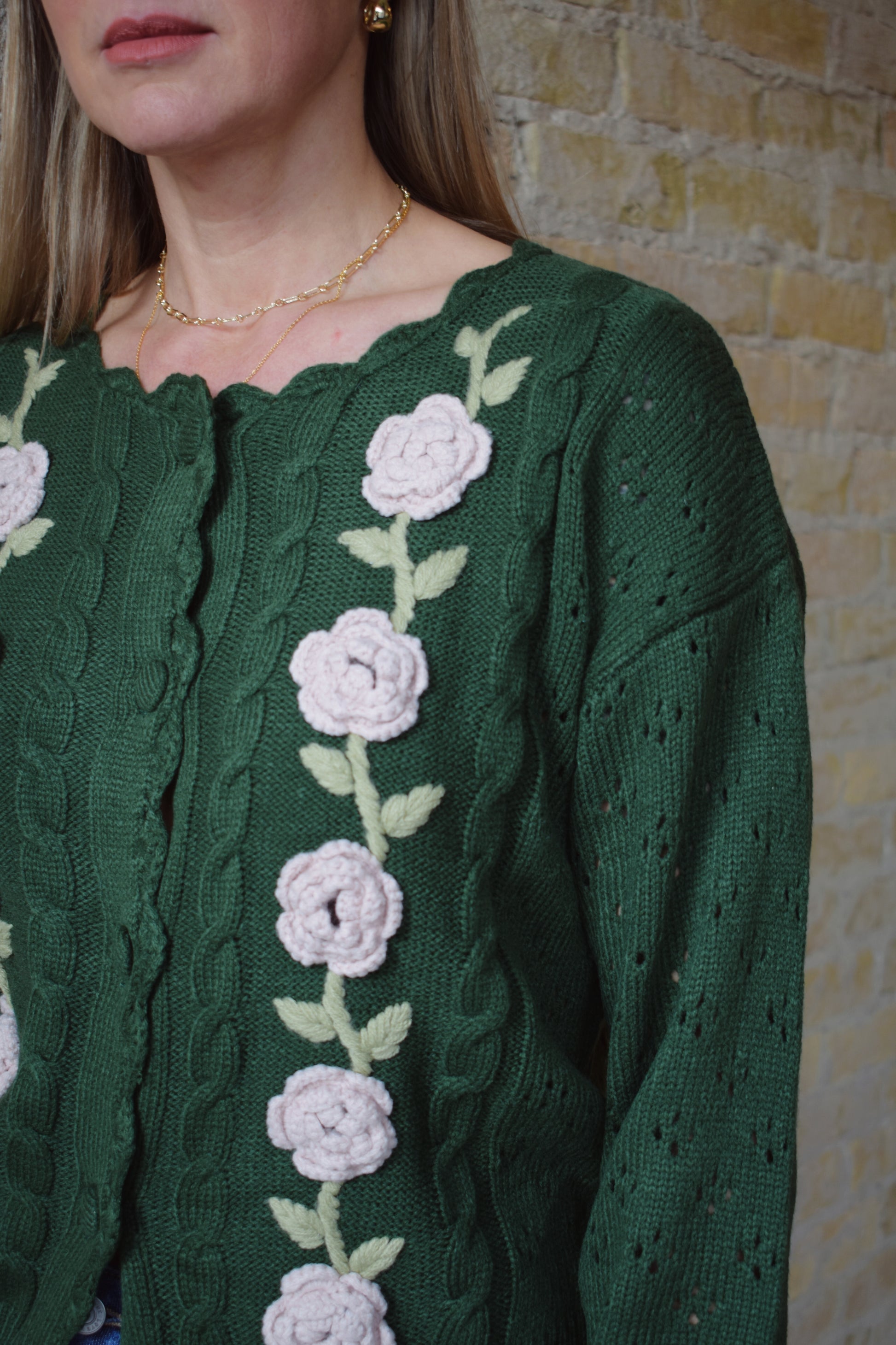 Elevate your wardrobe with this enchanting crochet cardigan that seamlessly blends nostalgia with modern style. Crafted from soft, breathable knit fabric, it features an intricate eyelet weave and stunning handmade crochet flowers adorned with delicate leafy stems running vertically down the front. The romantic scalloped crew neckline, cable knit detailing, and full button front with coordinating knit-covered buttons create an irresistibly charming silhouette. Finished with ribbed cuffs and hem for a polished, comfortable fit, this versatile piece is perfect for layering over your favorite basics and adding that coveted vintage-inspired touch to any outfit.