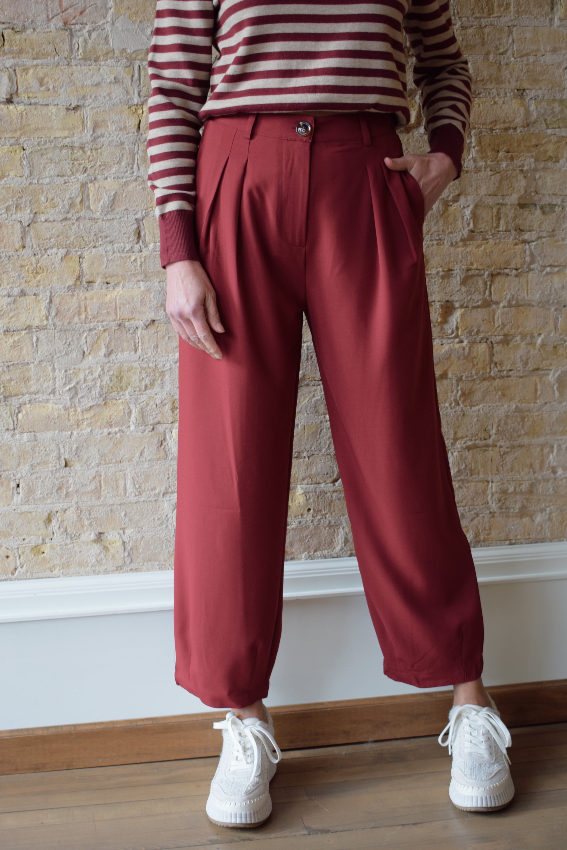 Elevate your everyday wardrobe with these sophisticated pleated barrel trousers—the perfect balance of refined style and all-day comfort. Crafted from a structured woven blend with a luxurious smooth finish, they feature a flattering high-waisted silhouette with signature pleated detailing that creates an effortlessly polished look. The relaxed wide-leg cut drapes beautifully while maintaining its tailored shape, making these trousers your go-to choice for both professional settings and weekend outings. Practical details include functional side slit pockets, back patch pockets, and a secure button-zip closure with belt loops. Finished with a clean hem, these versatile trousers deserve a permanent spot in your closet.