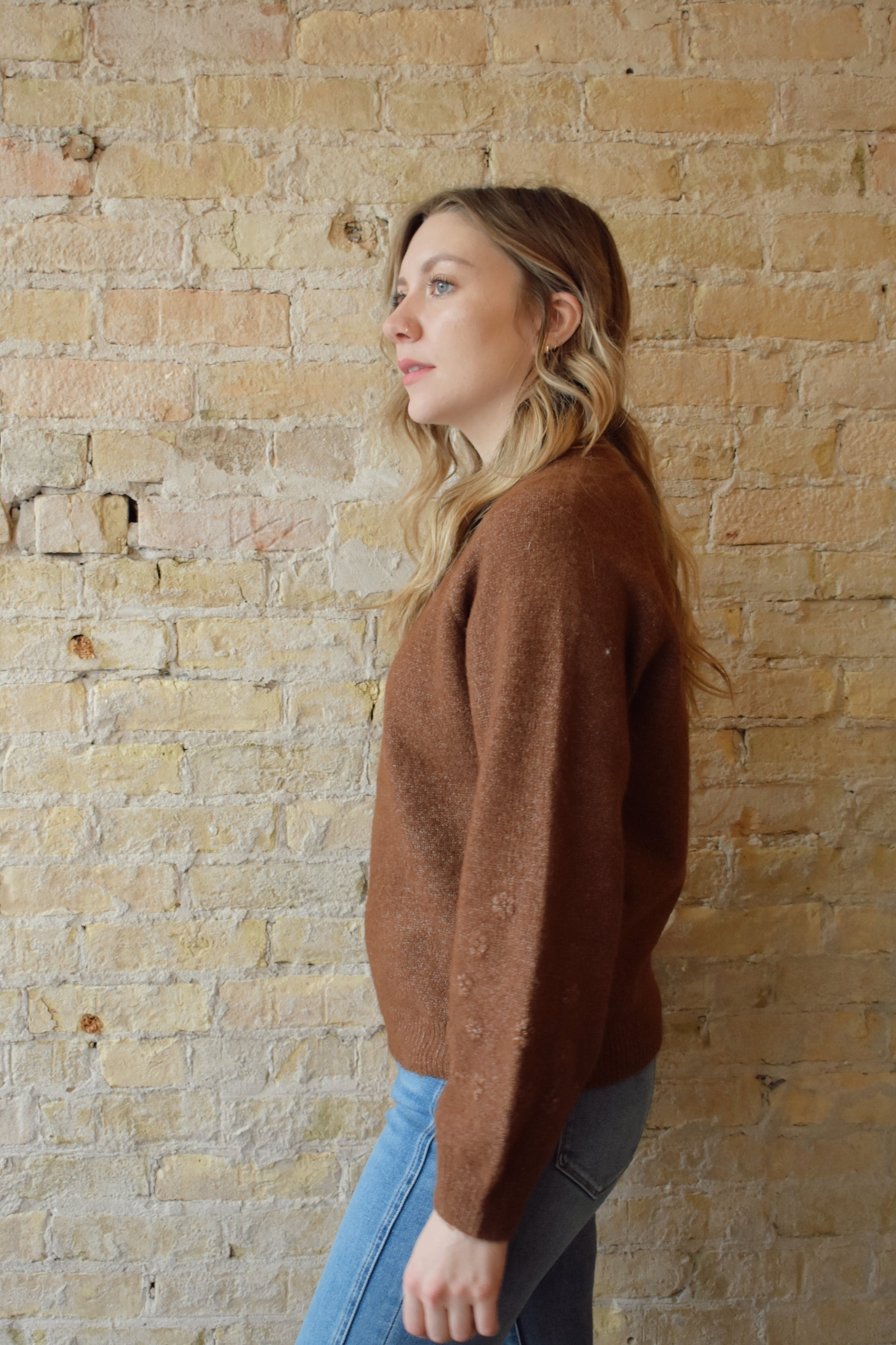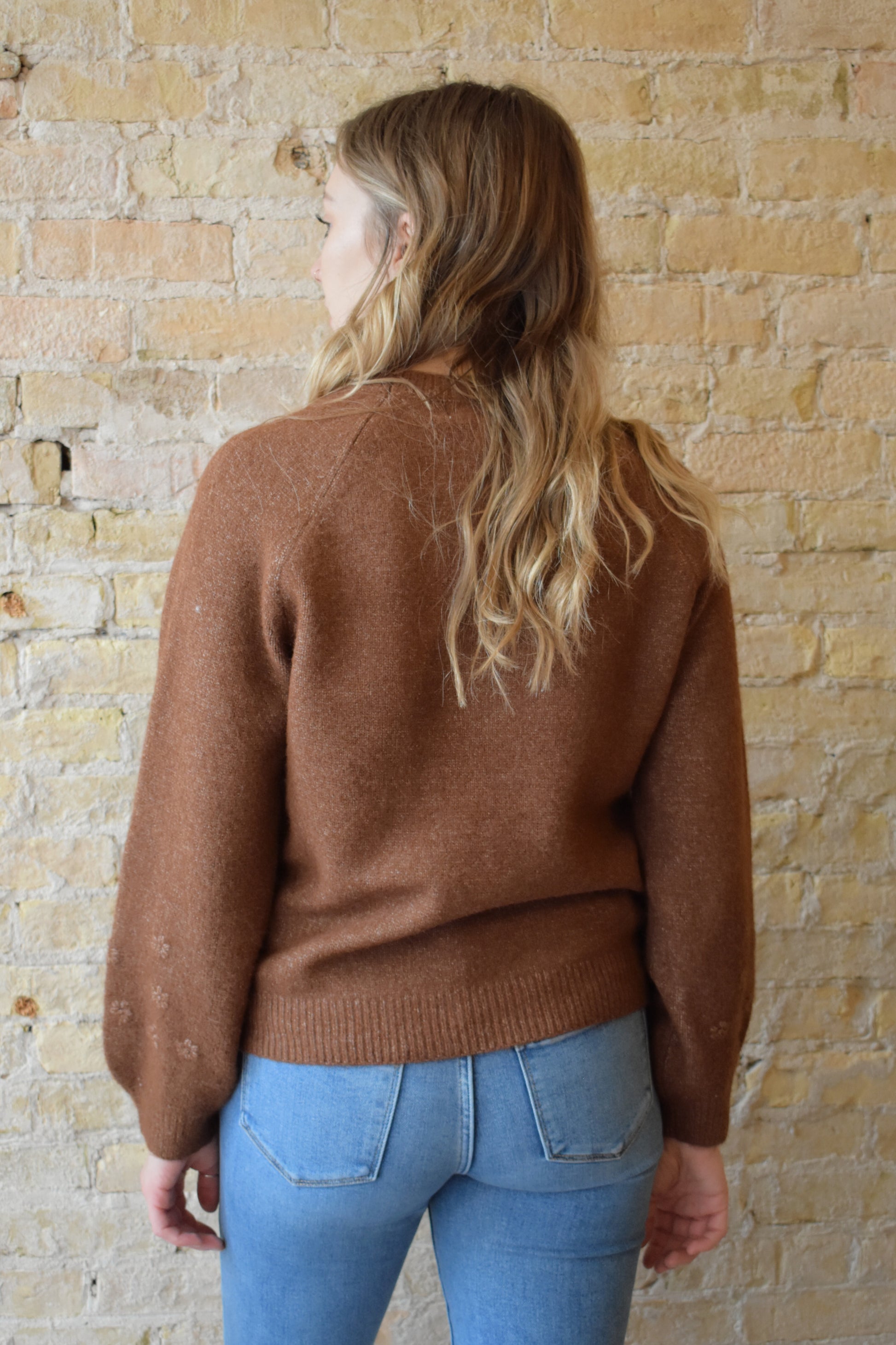 Embrace the season in style with this charming floral knit puff sleeve sweater. Crafted from soft, cozy sweater knit, it features a flattering round neckline and relaxed silhouette perfect for layering. The standout statement sleeves showcase dimensional 3D floral detailing that transitions beautifully into ribbed cuffs, while raglan seaming ensures comfortable movement. Finished with a ribbed hem for a polished look, this piece effortlessly transitions from casual days to cozy nights.