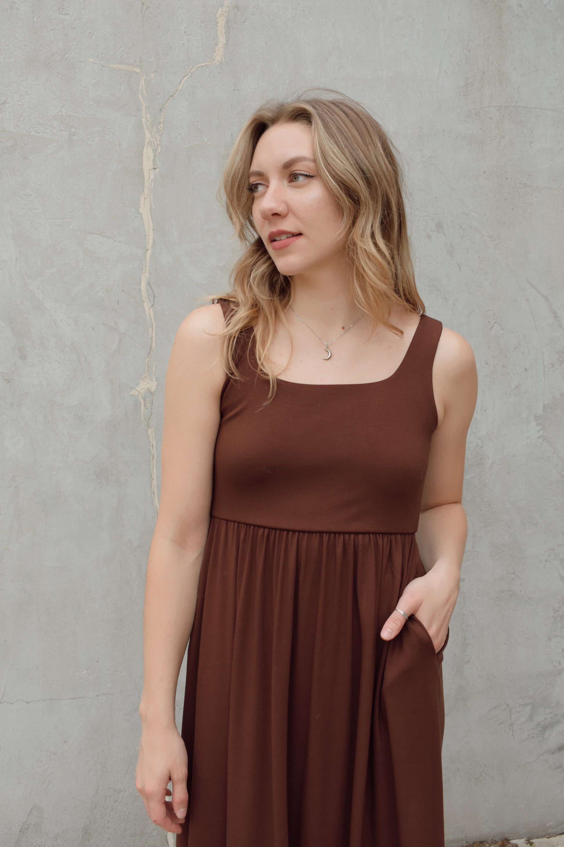 This midi-length sleeveless swing dress features a double-layered bodice for added coverage and support, along with convenient side pockets. Crafted from a soft, heavyweight jersey fabric, it provides exceptional stretch and comfort throughout the day.