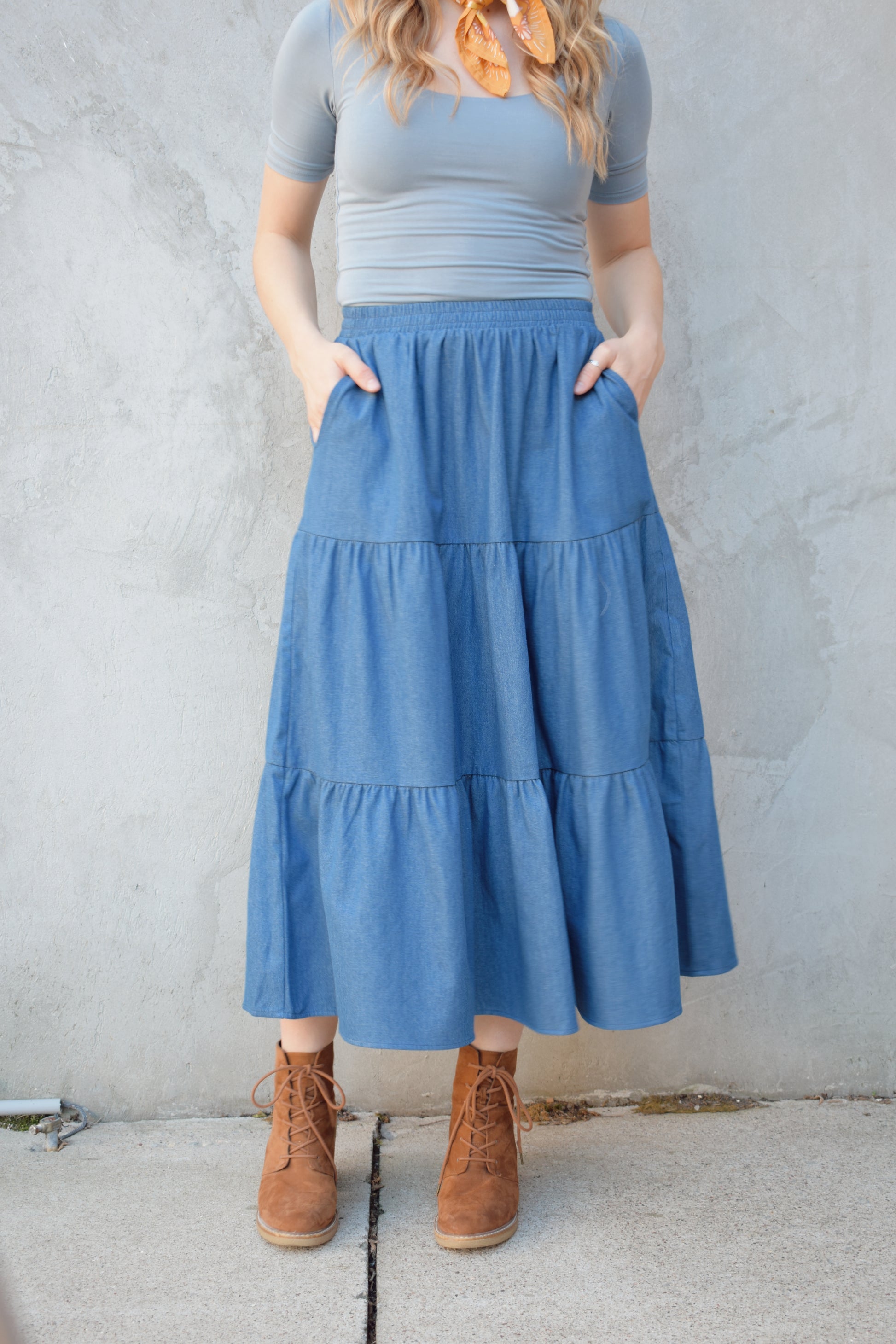 Elevate your casual wardrobe with this tiered midi denim skirt, designed to combine style and comfort effortlessly. Its elastic waistband ensures a flexible fit that moves with you, while the tiered design adds a flattering, feminine silhouette with subtle volume. Practical side pockets provide convenient storage for essentials, making this skirt as functional as it is fashionable. Perfect for pairing with your favorite tops and shoes, it’s an ideal choice for everyday wear or weekend outings. Experience a versatile, chic look that adapts seamlessly to your lifestyle.