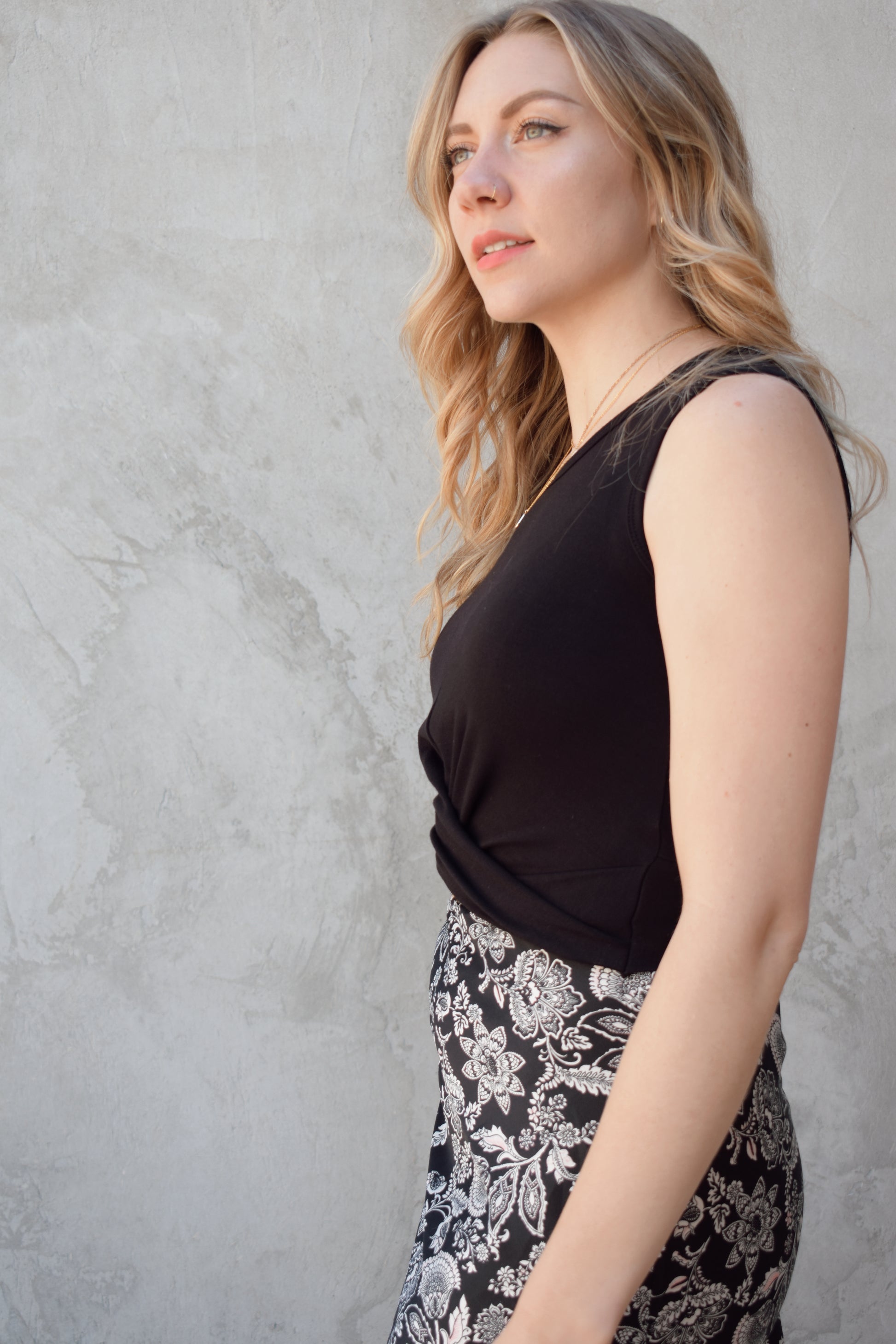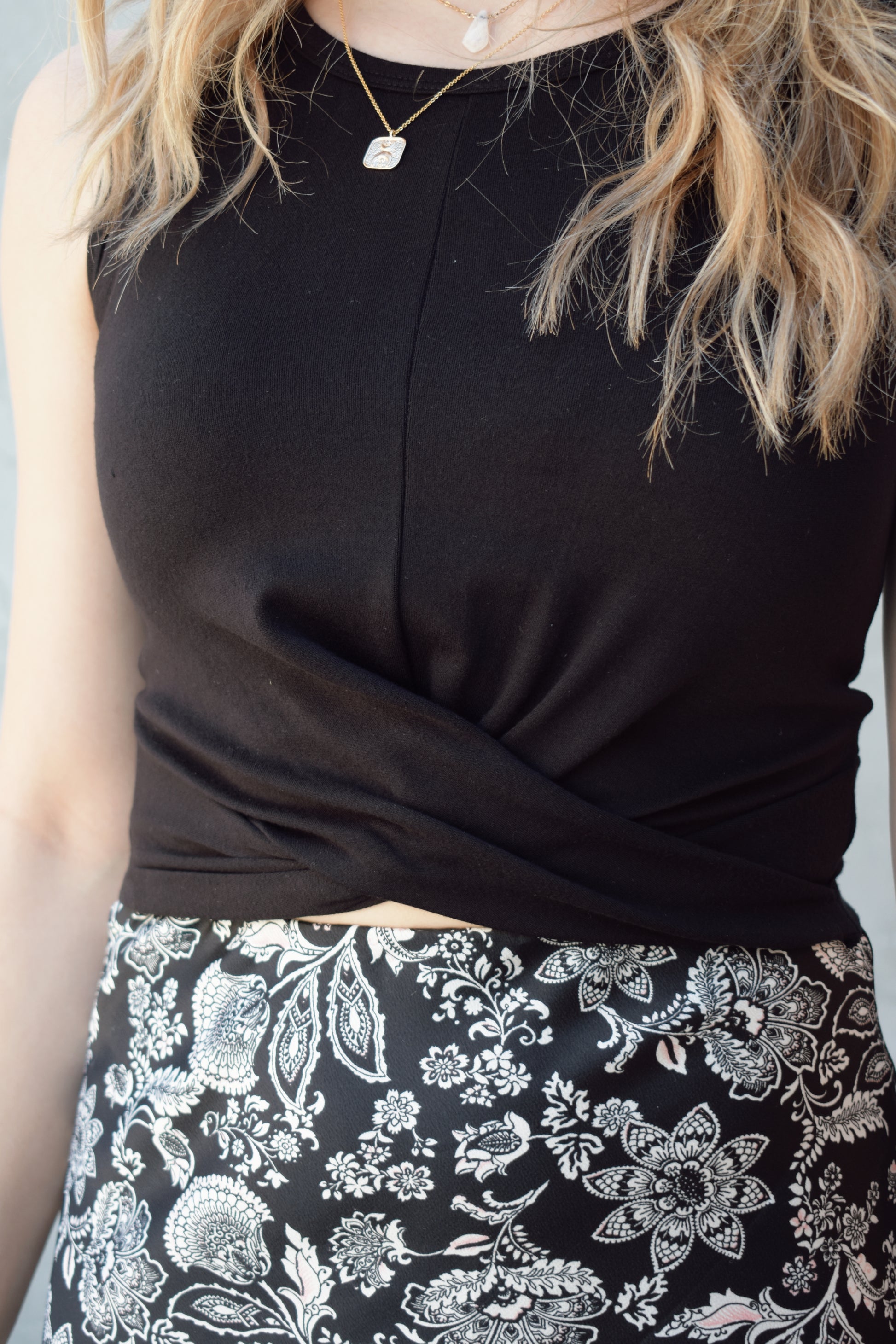 This sleeveless crop tank showcases a chic twist design and a flattering round neckline, making it an essential upgrade to your everyday basics.