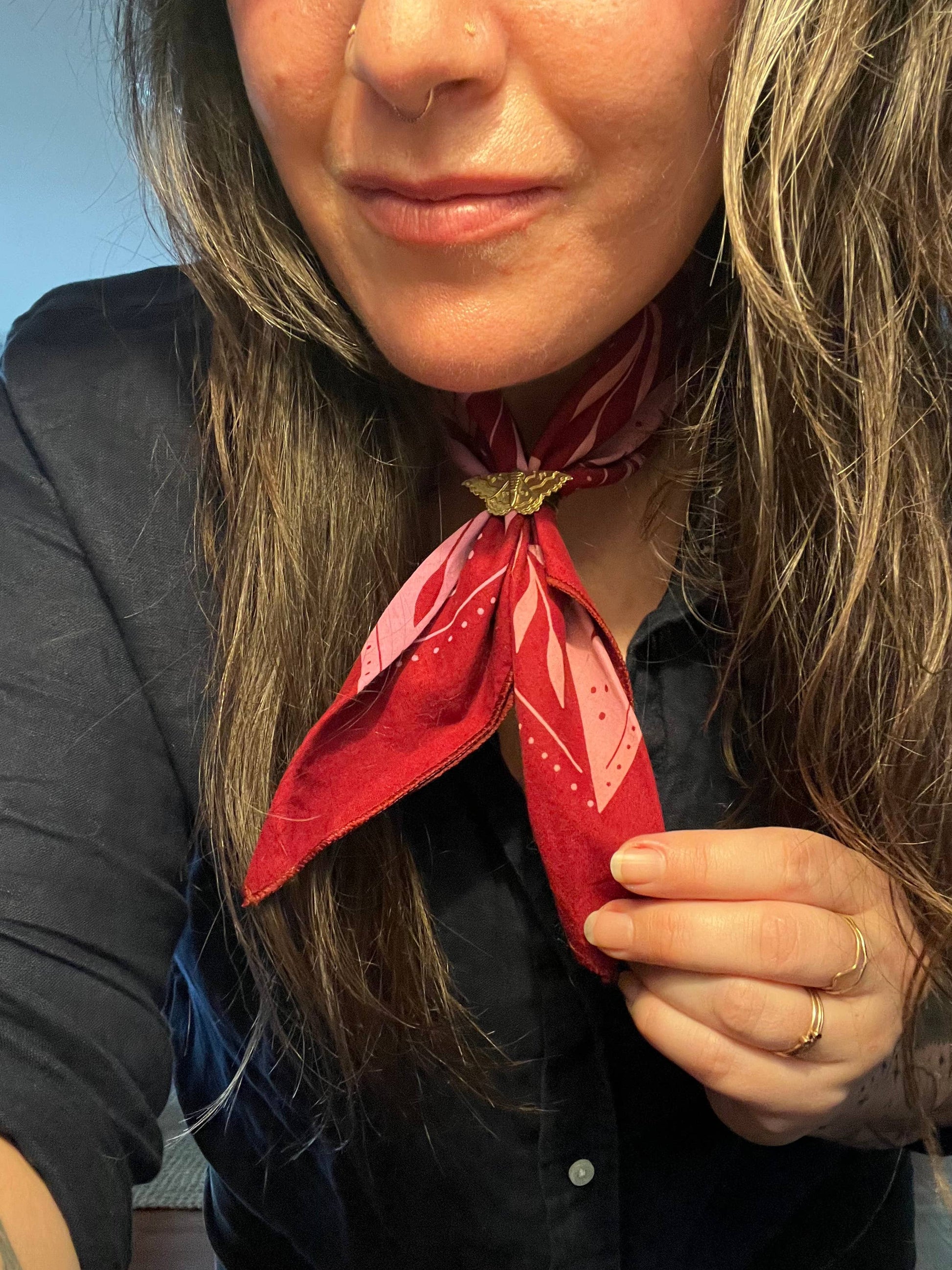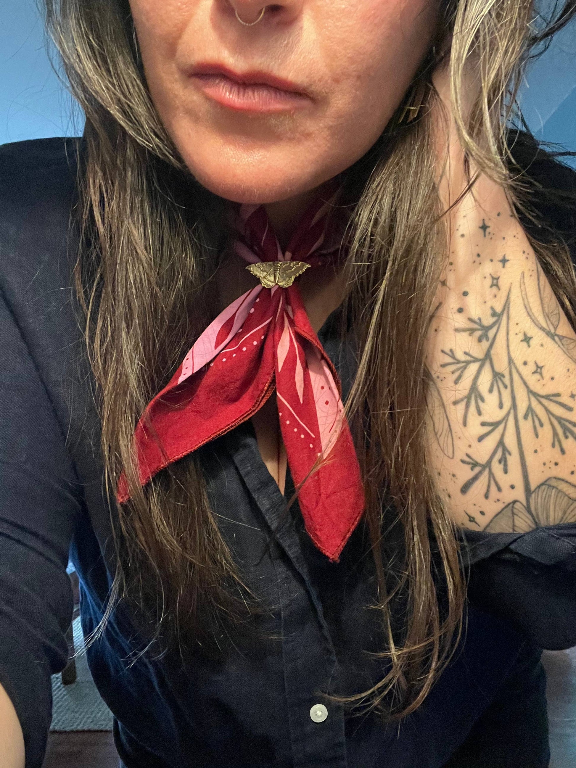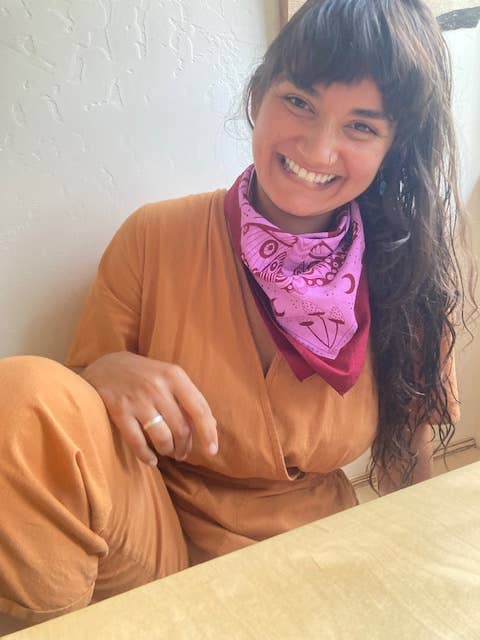 This 22” cotton bandana features a unique light/dark design that essentially gives you two bandanas in one, depending on how you fold it! One side features a moth and the other side features a snake, both surrounded with moons and twisting foliage. The design is silk screened with water-based ink in pink on a maroon/purple bandana. The ink becomes soft and pliable after just one wash, and will continue to soften overtime. These bandanas are printed in California using eco-friendly methods. This gorgeous, high-quality bandana has so many uses: wear it as a face covering, use it as wrapping paper, tie it in your hair, or hang it as art!