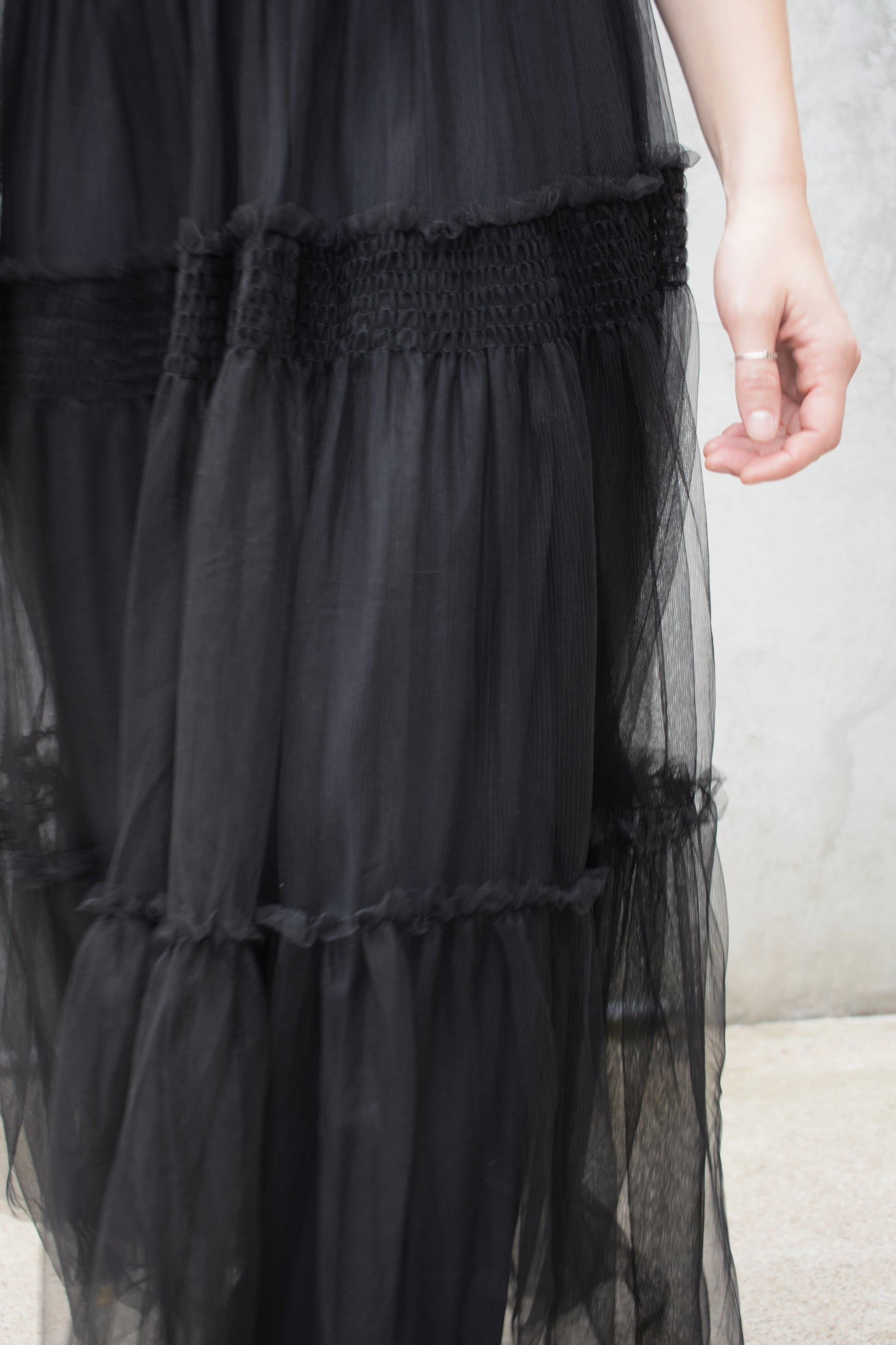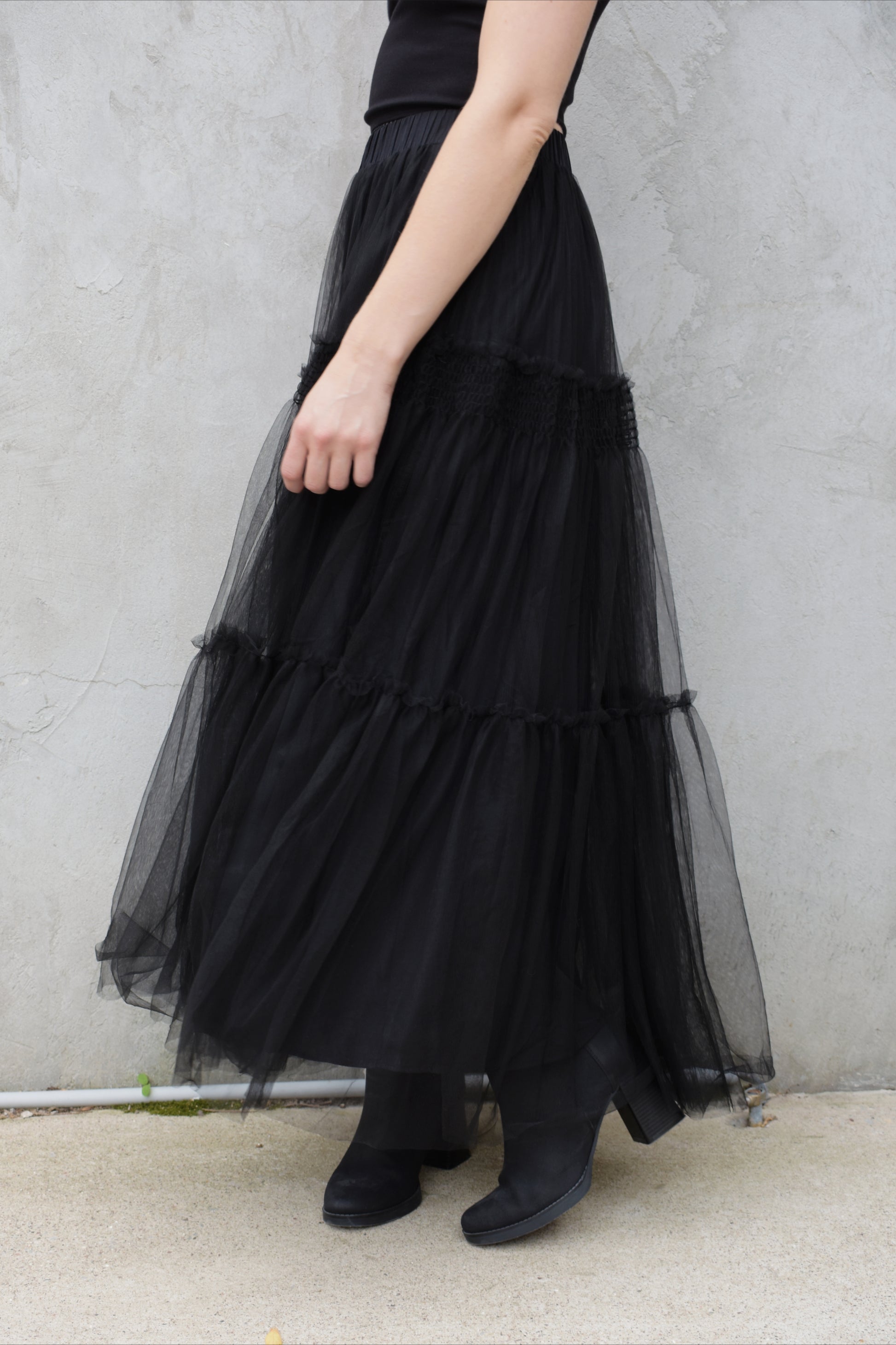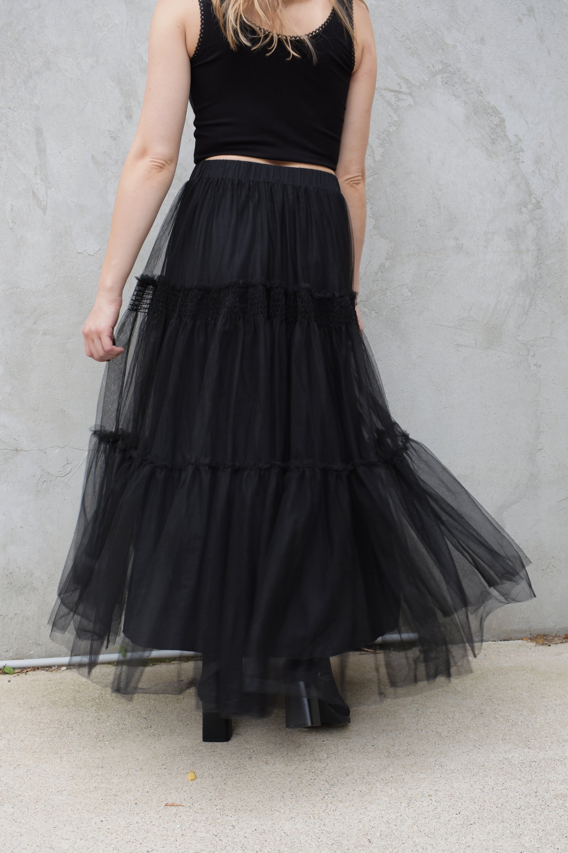 This black tiered maxi skirt features delicate tulle mesh fabric and a comfortable elastic waistband. Fully lined and designed at a flattering midi length, it effortlessly combines style and ease for your wardrobe.