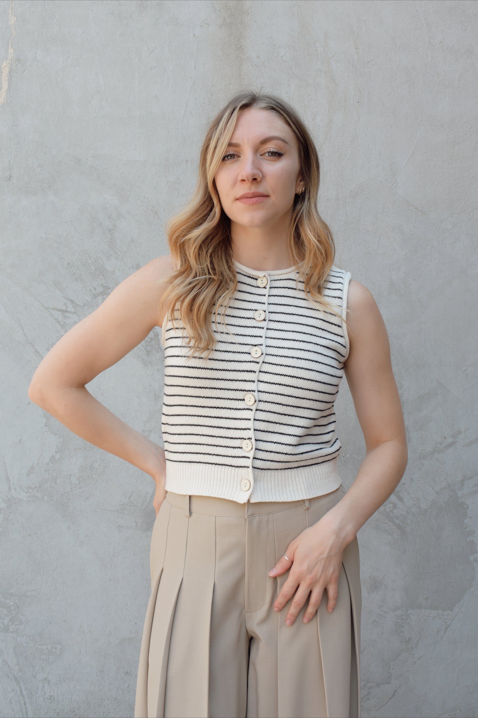 This striped knit vest is an essential layering piece for changing seasons. Crafted from a soft, breathable fabric, it offers comfort and style with a practical button-down front. Its lightweight, sleeveless design with ribbed edges pairs perfectly with tees, blouses, or can be worn alone for a sleek, simple look. The relaxed, slightly boxy fit ensures easy layering and effortless versatility.