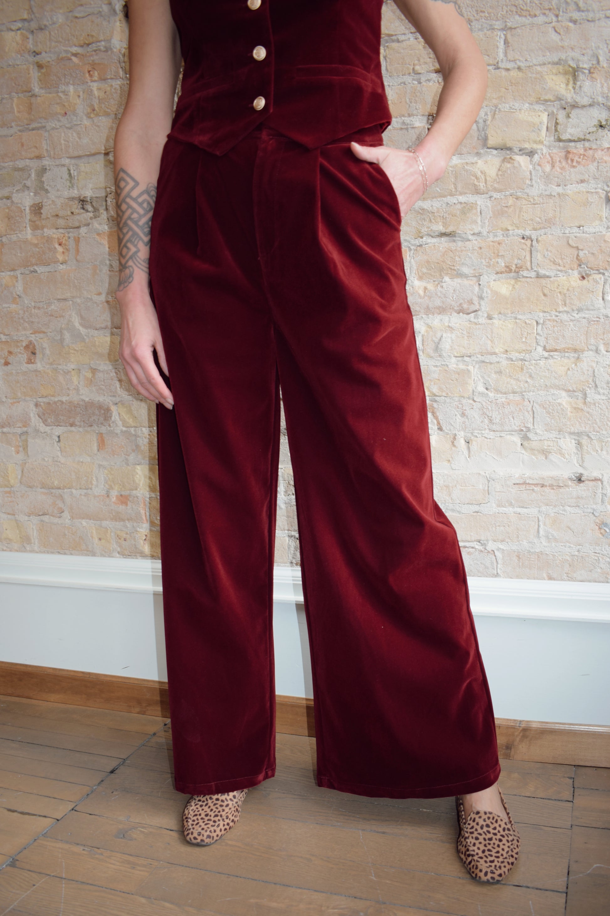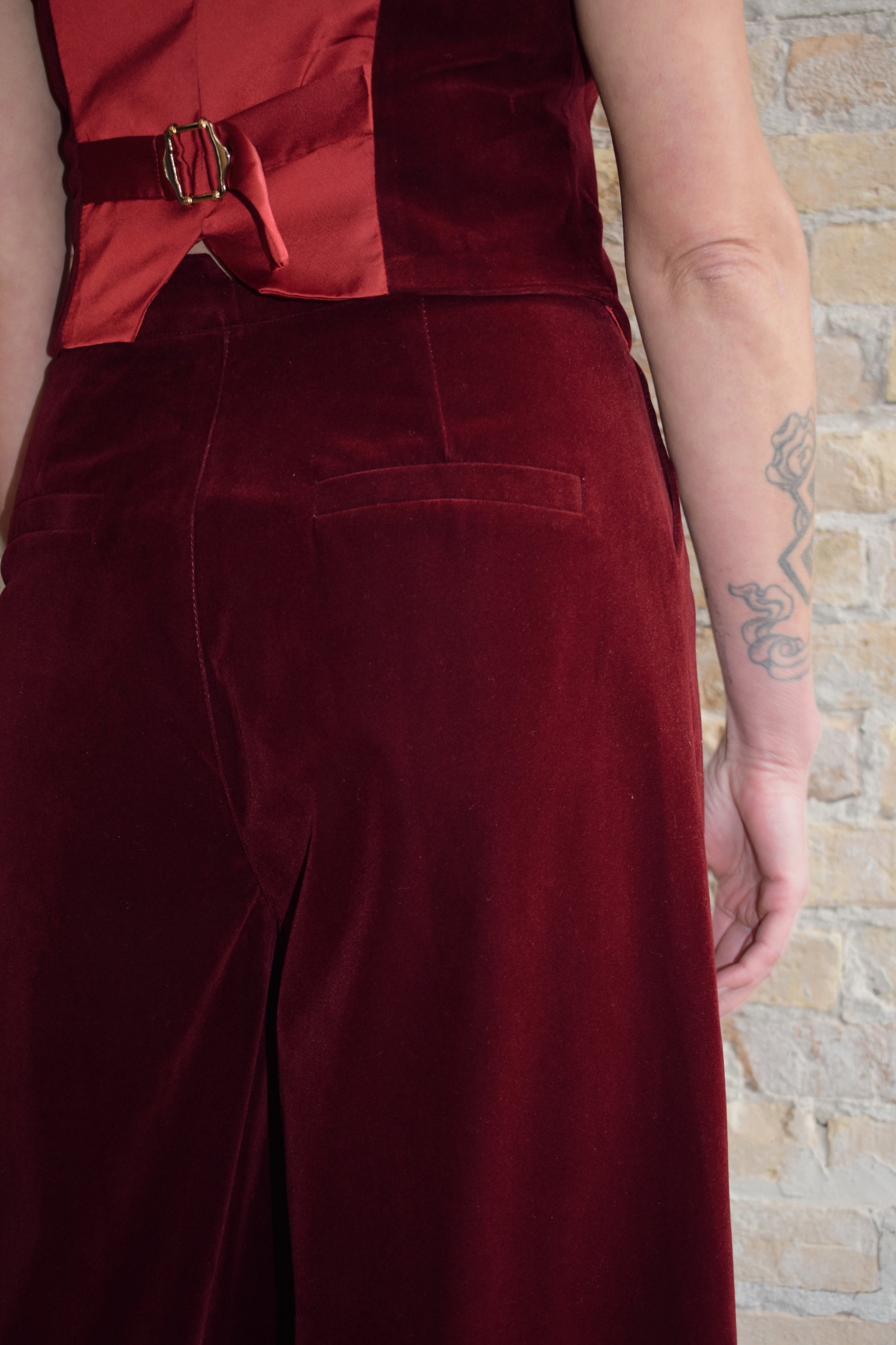Luxurious velvet fabric meets contemporary silhouette in these sophisticated trousers. The wide-leg cut offers effortless elegance and flattering movement, while the front closure ensures a polished finish. Elevate your wardrobe with this statement piece—pair with our matching vest for a coordinated, head-turning ensemble.